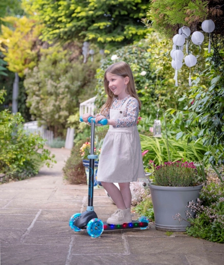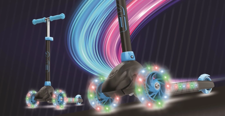 Svietiace kolesá aj hrana podesty dodajú jazde efekt a lepšiu viditeľnosť za šera. Stačí vložiť 3× AAA batérie (nie sú súčasťou).