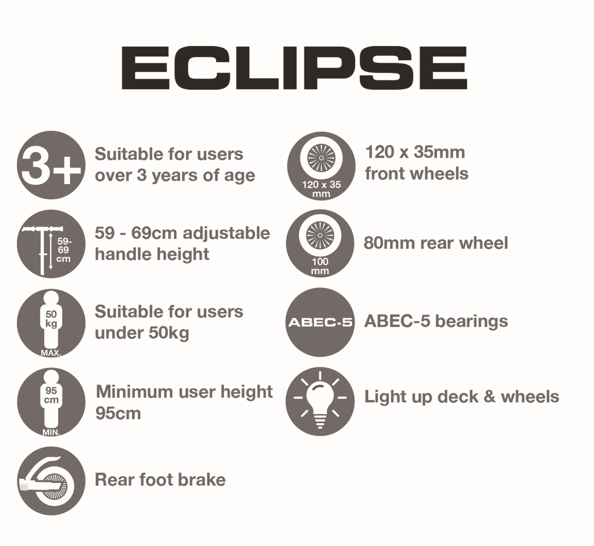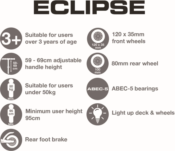Kolobežka EVO Eclipse je navrhnutá pre prvé krôčiky do sveta jazdy – tri kolesá zabezpečujú vysokú stabilitu, zatiaľ čo ľahká konštrukcia a nožná brzda nad zadným kolesom poskytujú istotu pri zastavení. LED podsvietenie kolies a podesty premení každú cestu na zábavnú svetelnú šou a zlepší viditeľnosť za šera.