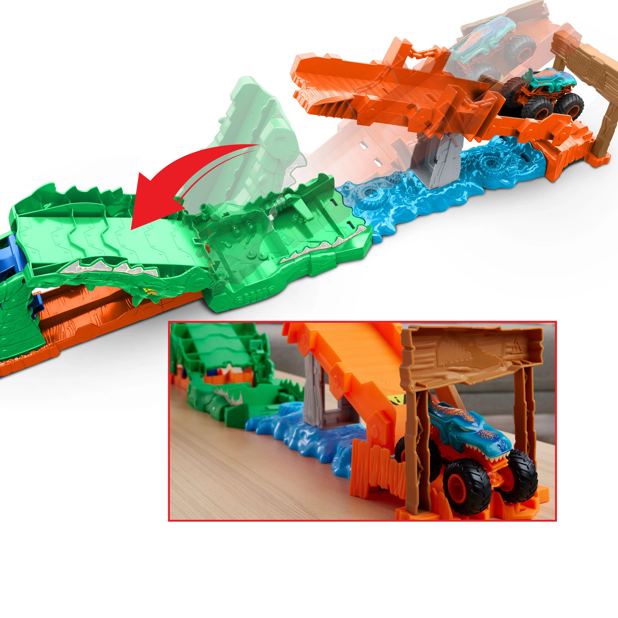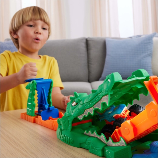 Tento farebný kaskadérsky set kombinuje akciu, napätie a kreatívne hranie. Vystreľ Mega Wrex po oranžovej rampe, zdolaj padací most a skús preskočiť hladného krokodíla – alebo skončíš priamo v jeho tlame. Výsledok závisí od sily odpalu, takže každá jazda je iná a deti si trénujú koordináciu aj odhad.