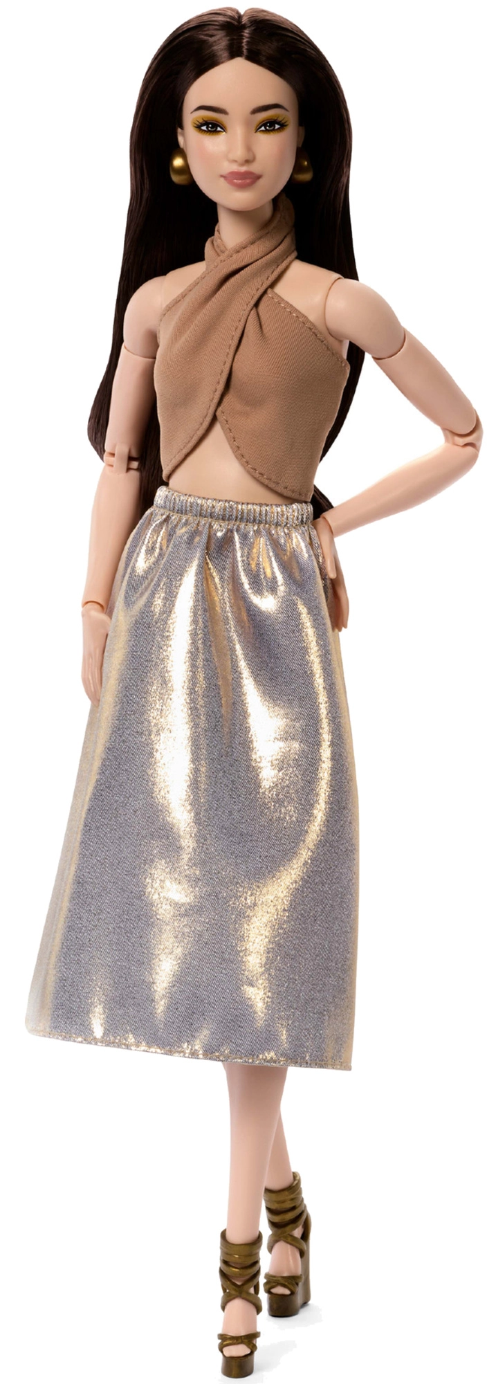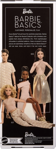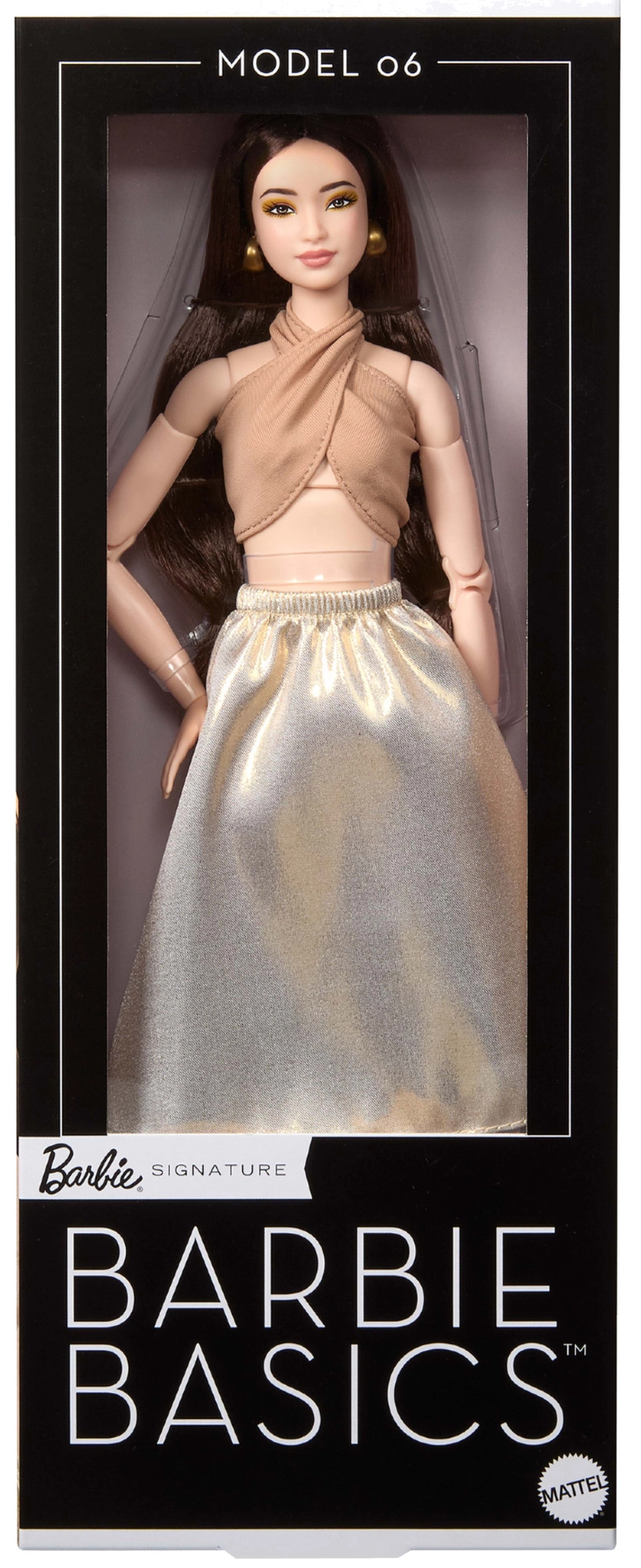 Model 06 zo série Barbie Signature Basics prináša minimalistickú eleganciu v odtieňoch svetlo hnedej a zlatej. Kombinácia elegantného topu a voľnej sukne podčiarkuje moderný, nadčasový vzhľad. Bábika má svetlú pleť, štíhlu siluetu a harmonický, decentný make-up, ktorý zvýrazňuje jej prirodzenú krásu.
