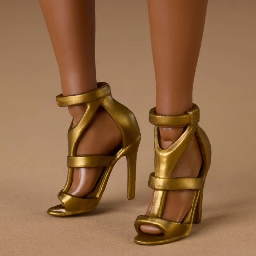 Štýl je ladený do neutrálnych a nadčasových tónov so zlatými akcentmi – trblietavé zlaté šaty dopĺňa decentný make-up a jemné detaily. Bábika je kompatibilná s doplnkami BARBIE a skvele zapadne do kreatívnych outfitov a mixovania štýlov.