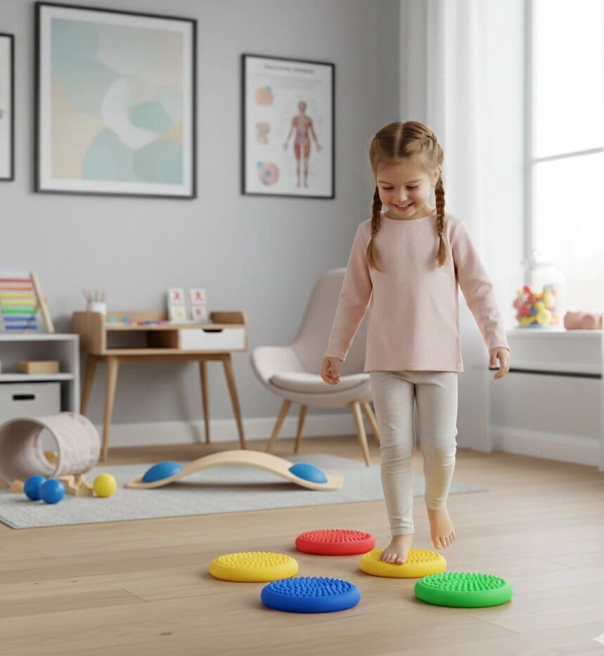 Objavte zábavný spôsob, ako podporiť rovnováhu, koordináciu a zmyslové vnímanie detí aj dospelých. Táto sada štyroch farebných diskov s výraznou textúrou ponúka protišmykový povrch, príjemnú masáž chodidiel a efektívny tréning stability. Vyrobené z bezpečných materiálov – bez ftalátov, BPA a ťažkých kovov – ideálne na domáce cvičenie, do škôlok aj na fyzioterapiu.