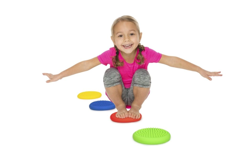 Farebné disky motivujú deti k pohybu, rozvíjajú koordináciu, propriocepciu a posilňujú hlboký stabilizačný systém.