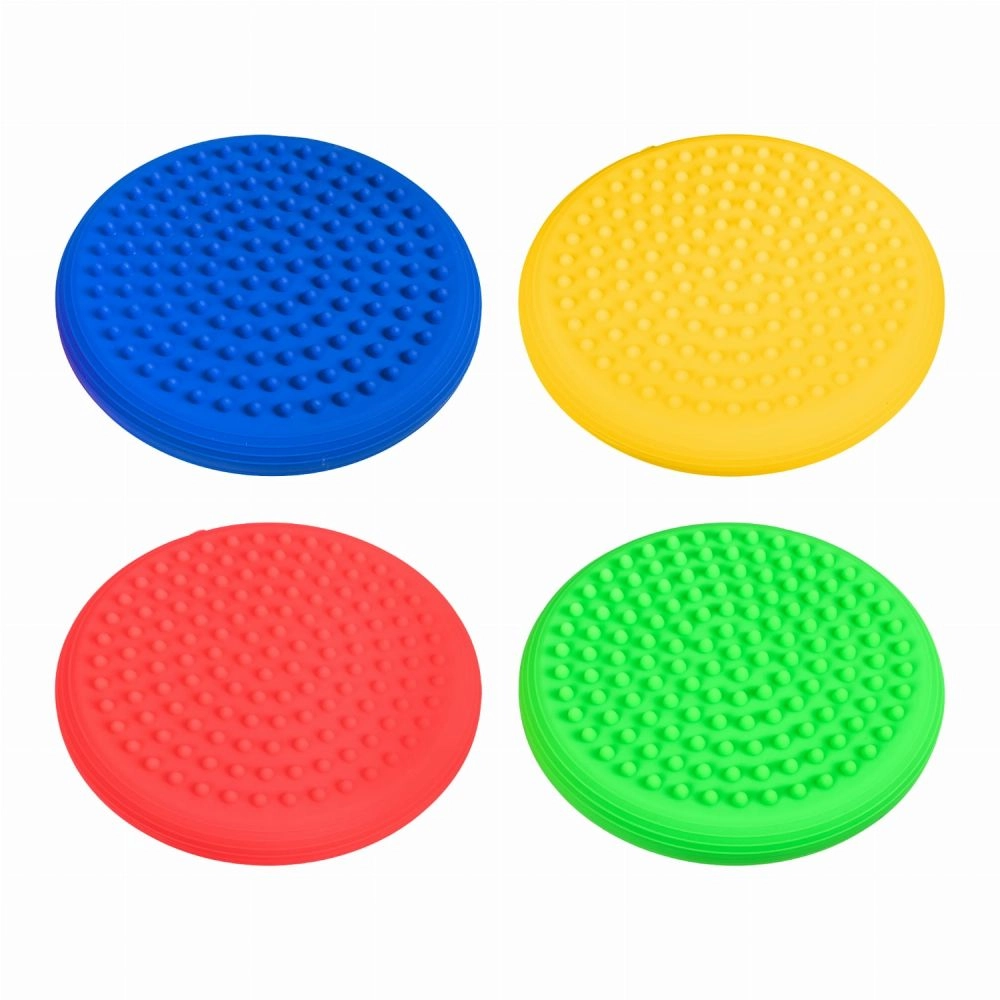 Disky sú vyrobené z odolného, pružného materiálu, ktorý je príjemný na dotyk a odolá každodennému používaniu. Bezpečnosť je na prvom mieste – produkt je bez ftalátov, BPA a ťažkých kovov a spĺňa CE. Uplatnenie nájdu pri detských hrách, v ergoterapii a fyzioterapii, aj ako masážne podložky na stimuláciu chodidiel.
