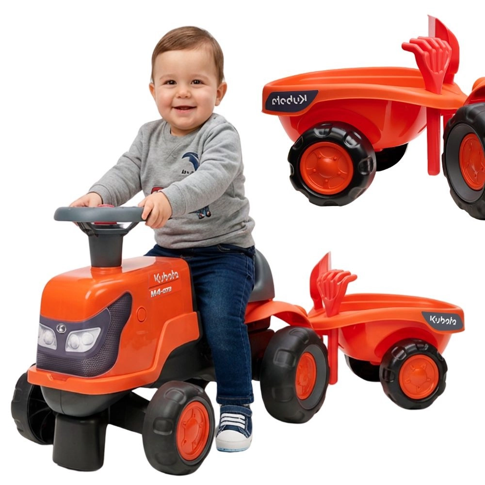 Roztomilý jazdiaci traktorček FALK KUBOTA pre najmenších záhradníkov prináša bezpečnú zábavu doma aj vonku. Má tiché kolesá, volant s klaksónom, mini príves a pieskové náradie (hrabličky a lopatku). Vyrobený vo Francúzsku zo 40 % recyklovaného plastu, so zaoblenými tvarmi a živými farbami. Súčasťou sú 2 sady samolepiek na personalizáciu vrátane vlastnej ŠPZ.