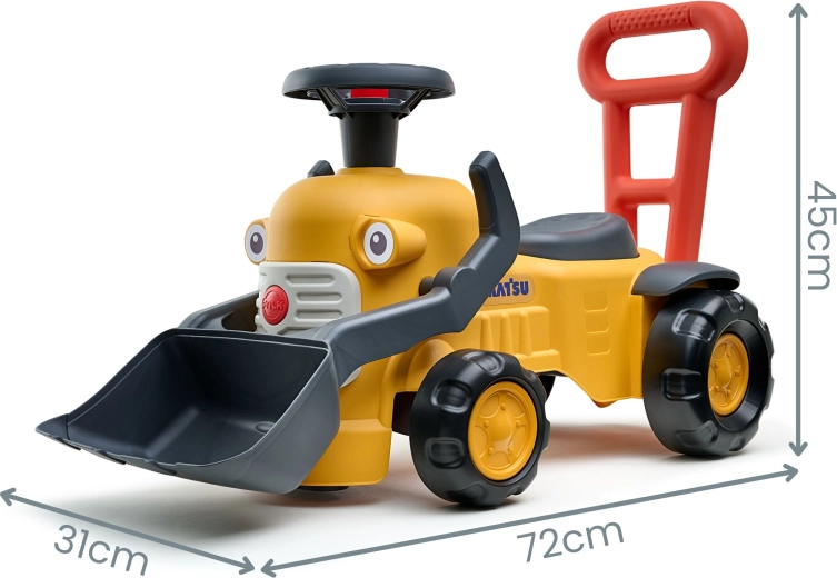 Toto detské odrážadlo v dizajne stavebného stroja KOMATSU kombinuje zábavu s rozvojom zručností. Vďaka mechanicky ovládanej prednej lyžici môžu malí stavitelia naberať piesok či kocky, zatiaľ čo klaksón na volante pridáva hre realistické prvky. Vysoké ergonomické operadlo/úchyt slúži ako tlačné madlo pre prvé krôčiky a lepšiu stabilitu.