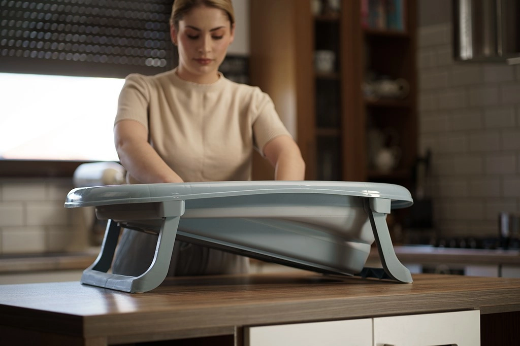 Ergonomicky navrhnutá vanička sa ľahko skladá na výšku približne 10 cm, takže šetrí miesto v kúpeľni aj v domácnosti. Stabilné plastové nožičky sa jednoducho sklopia pod vaničku a zaručia bezpečné a pevné postavenie počas kúpeľa.
