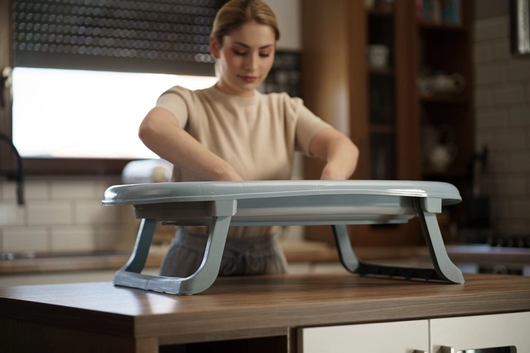 Vanička sa počas pár sekúnd zloží na výšku približne 10 cm. Ideálna pre malé kúpeľne, cestovanie aj nenápadné uloženie po kúpaní.