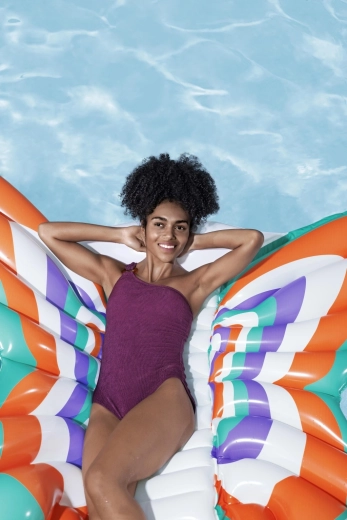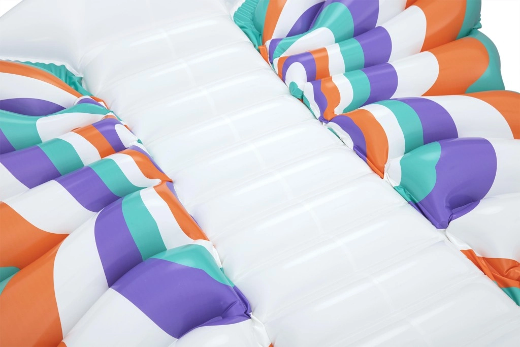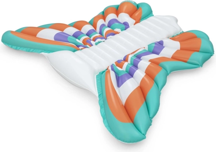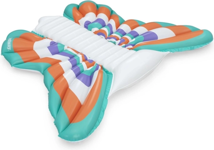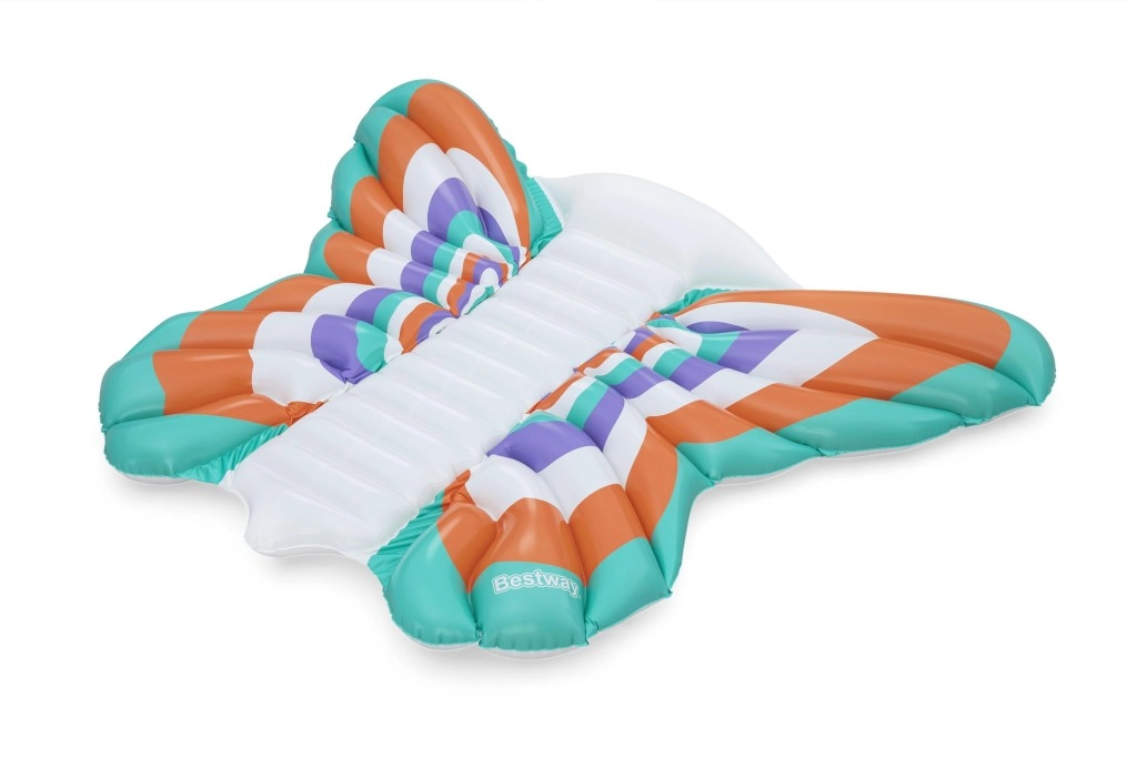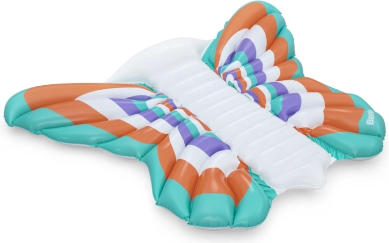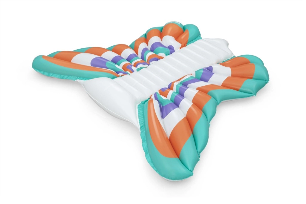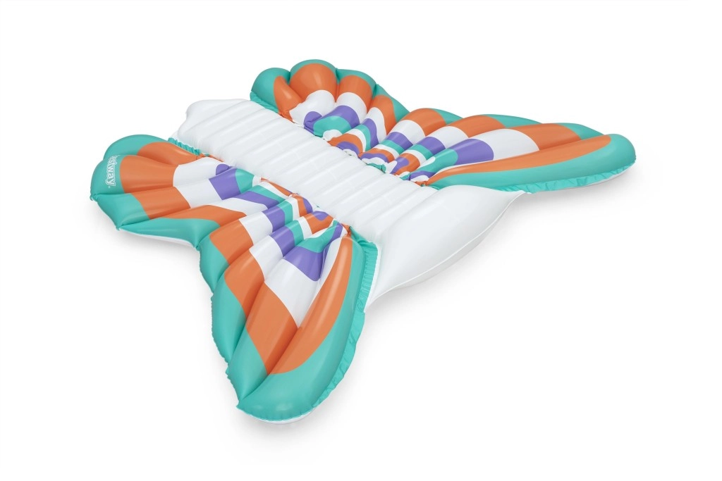 Táto štýlová nafukovacia matrac v dizajne motýlích krídel prináša skvelú kombináciu komfortu a zábavy. Farebné panely v tónoch oranžovej, tyrkysovej, fialovej a bielej vytvárajú pútavý vzhľad, zatiaľ čo rebrovaný stredový pás poskytuje pohodlné oprenie chrbta a uvoľnenú polohu na vode.