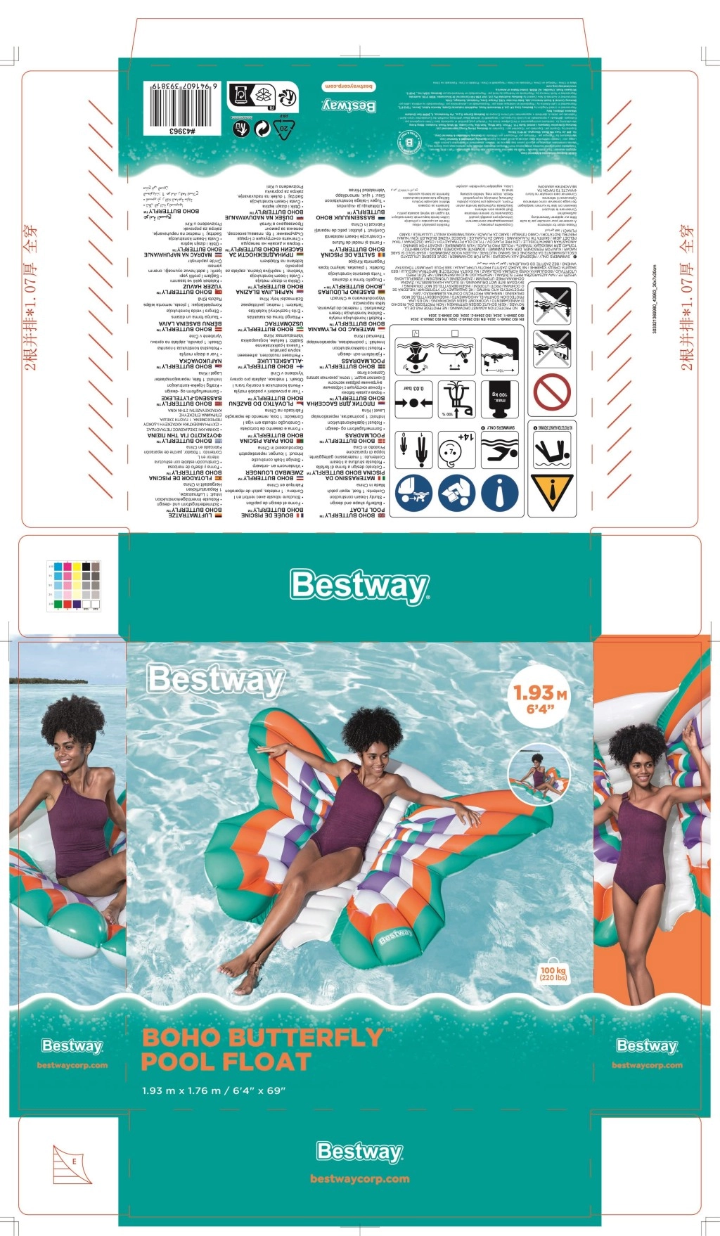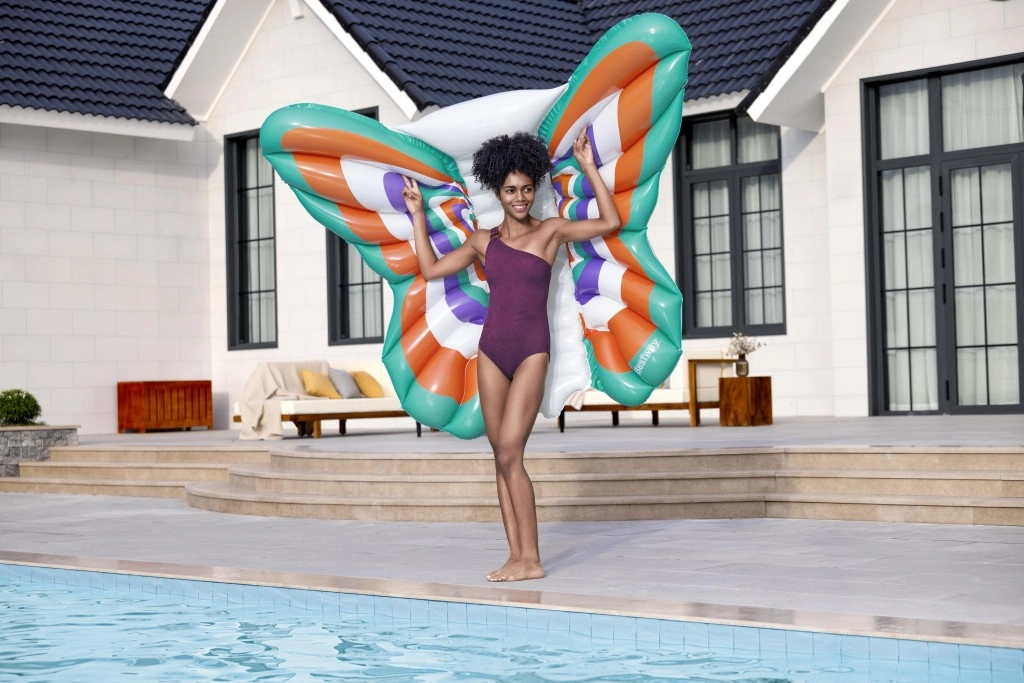 Užite si leto na vode s nafukovacou matracou v tvare motýľa s rozmermi 193 × 176 cm. Ponúka priestorné a pohodlné ležanie, stabilitu na hladine a odolný materiál s technológiou Color Shield™, ktorý udržiava farby jasné a nefarbí mokrú pokožku. Vďaka maximálnej nosnosti 100 kg a rýchlemu nafukovaciemu ventilu je ideálna do bazéna, na jazero aj k moru.