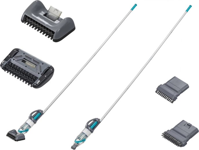 V balení nájdete dve vymeniteľné čistiace hlavice na rôzne povrchy, od rovného dna až po rohy a schody. Modulárna tyč s dĺžkou 2 m umožňuje pohodlný dosah bez zohýbania; po odpojení sa z AquaGrip stáva obratný ručný vysávač na detailné čistenie. LED svetlo spriehľadní prácu aj v horších podmienkach.