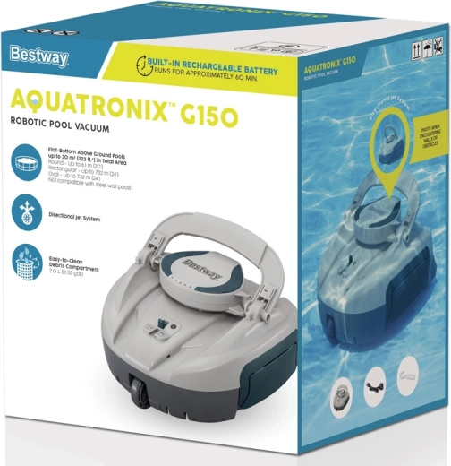 Robotický vysávač BESTWAY AquaTronix G150 prináša pohodlnú a efektívnu údržbu bazéna vďaka plne bezkáblovej prevádzke. Inteligentné vodné senzory a smerové trysky zabezpečujú spoľahlivý pohyb po dne a automatické zapnutie po ponorení aj vypnutie po vybratí z vody. Veľký filtračný kôš s objemom 2,0 l ľahko vyberiete a vyprázdnite počas pár sekúnd.