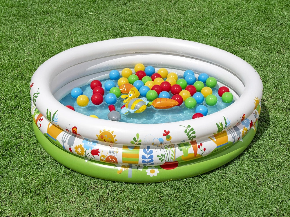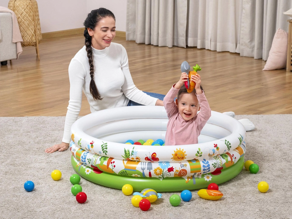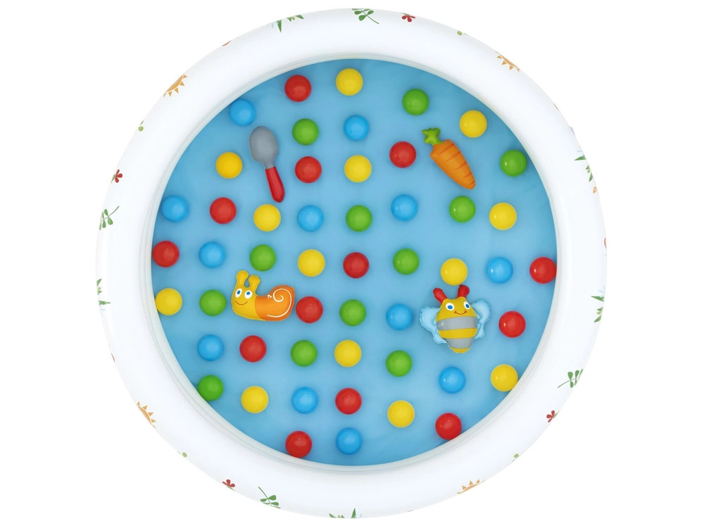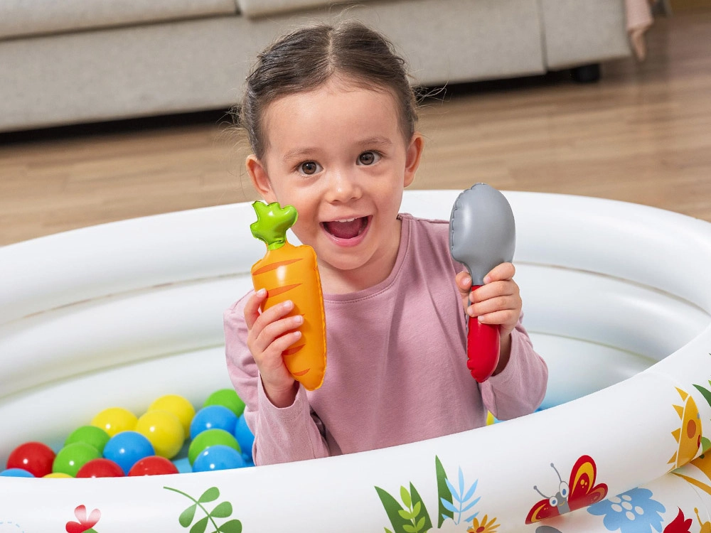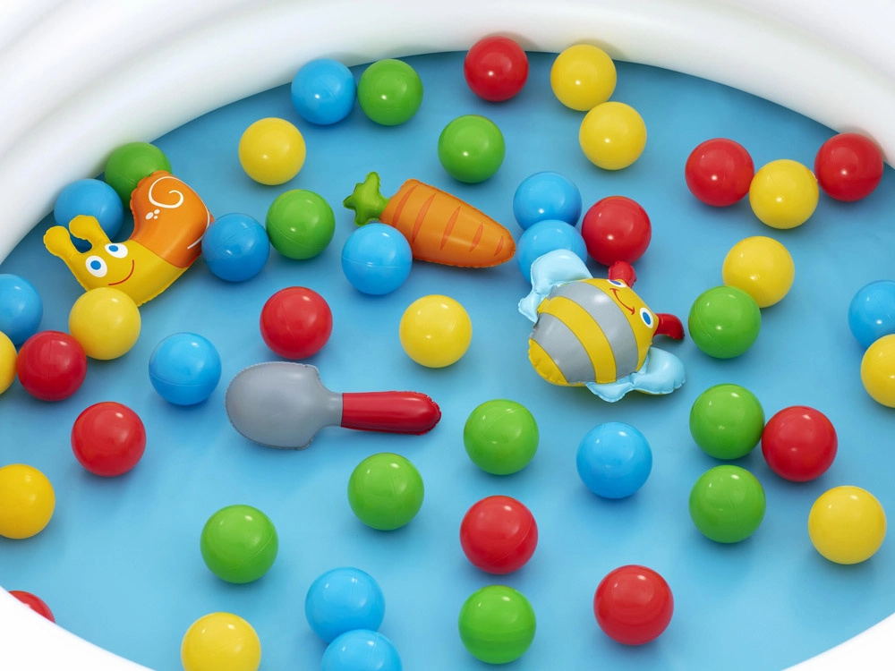 Súčasťou je 46 farebných loptičiek a 4 otváracie loptičky–prekvapenia s roztomilými hračkami (napr. slimák, včielka, mrkvička, naberačka), ktoré podnecujú zvedavosť a kreativitu. Jednoduchá inštalácia, nenáročná údržba a priložená opravná záplata zaručujú bezstarostné používanie.
