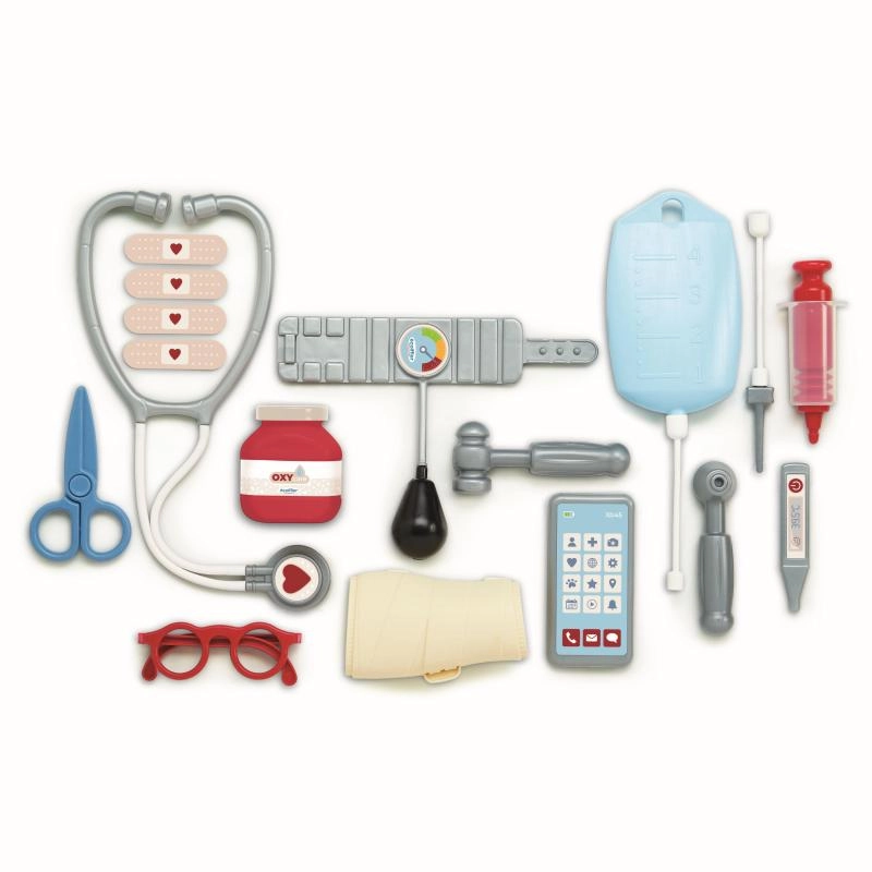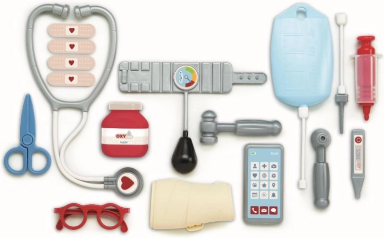 - 17 ks (stetoskop, okuliare, telefón, tlakomer, otoskop, reflexné kladivko, lieková fľaštička, teplomer, infúzny vak, injekčná striekačka, sadrová ortéza, nožnice, 4× náplasť)