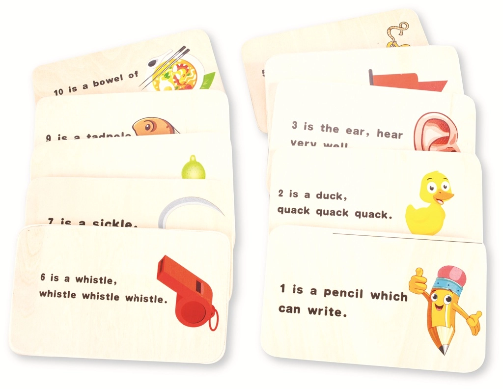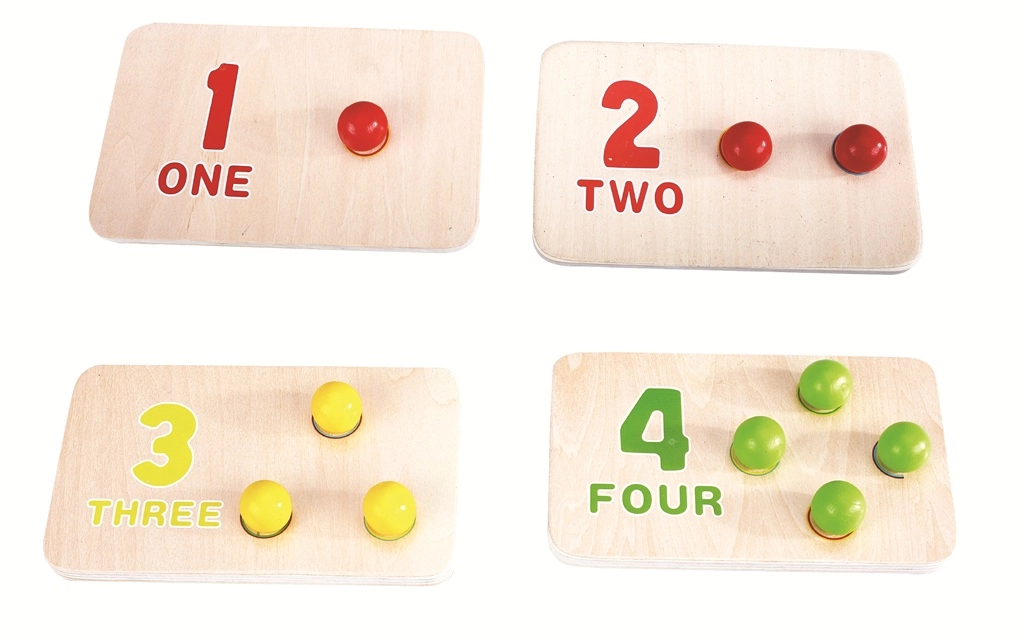 Každá doštička zobrazuje číslo a zodpovedajúci počet otvorov pre kolíky/guličky. Deti tak prirodzene prepoja číslicu s množstvom a trénujú jemnú motoriku.