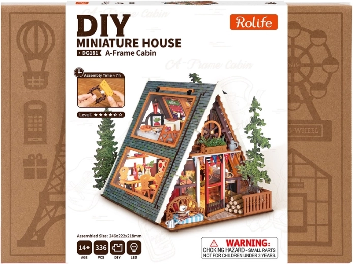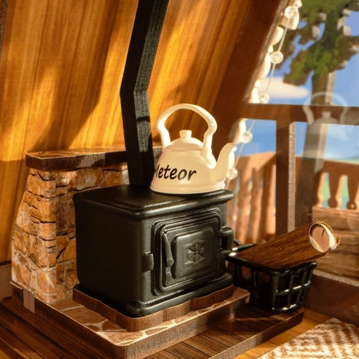 Vytvorte si atmosféru moderného glampingu priamo doma. Model chaty so sedlovou strechou zaujme veľkými presklenými stenami, otvárateľným oknom a premysleným interiérom: slnečný obývací priestor, plne vybavená jedáleň, drevené schodisko a podkrovná spálňa. Nechýba balkón s minizáhradkou, drevená pec, dekoratívne rámy ani gitara – každý detail poteší milovníkov miniatúr.