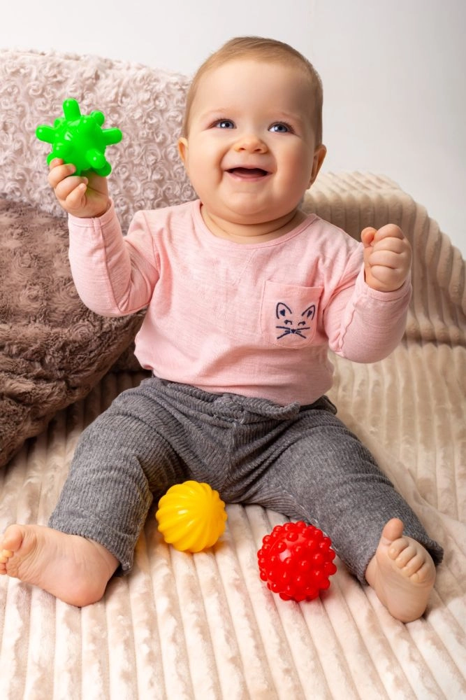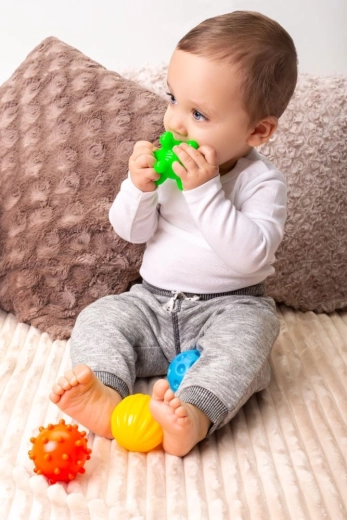 Každá loptička ponúka iný povrch na stimuláciu hmatu, masáž dlaní a tréning úchopu – ideálne na rozvoj jemnej motoriky.