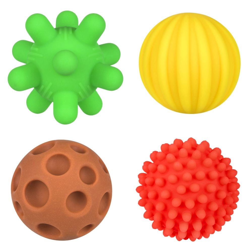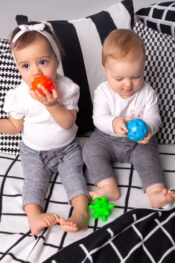 Každá loptička má odlišný povrch pre rôzne typy stimulácie: vrúbkovaný, bodkovaný, jemne ryhovaný či „pichľavý“ na masáž dlaní. Mäkké stláčateľné prevedenie je šetrné k ďasnám a podporuje bezpečné hryzenie.