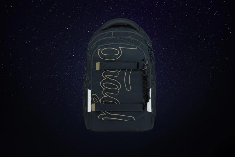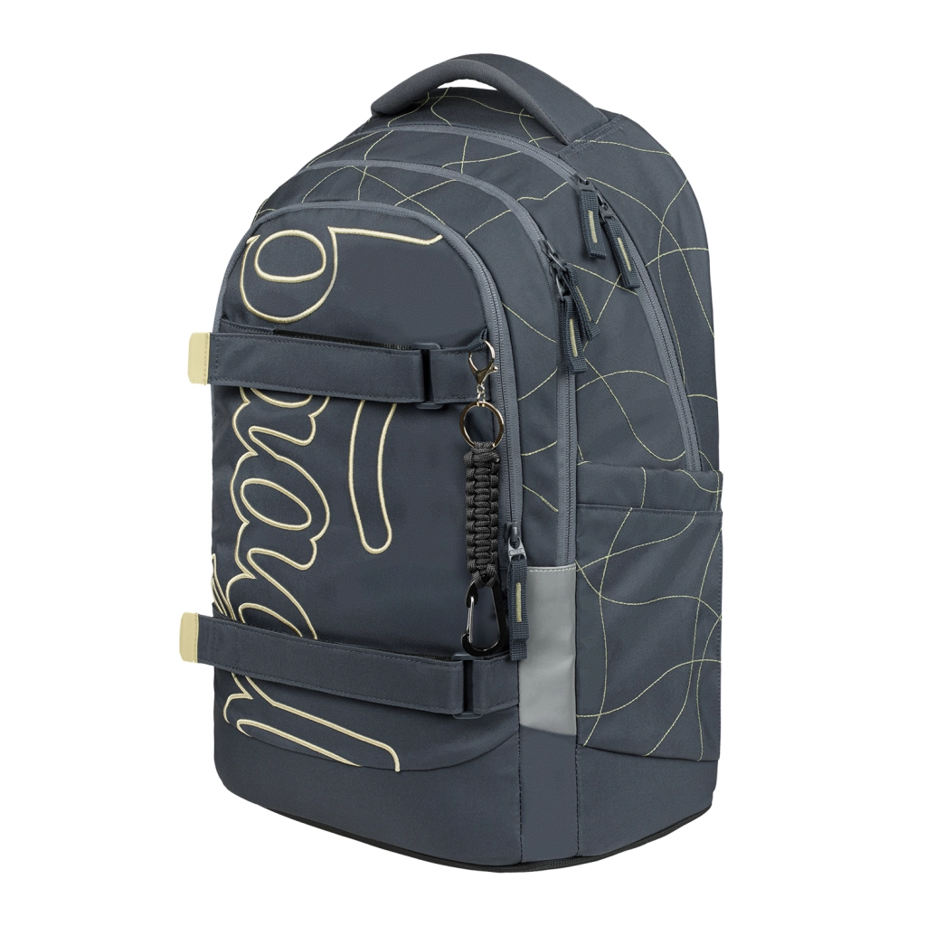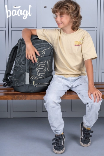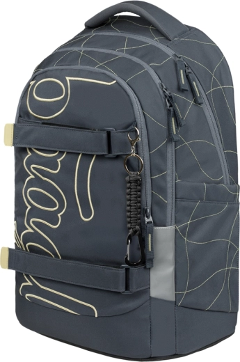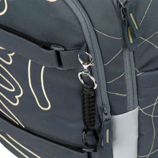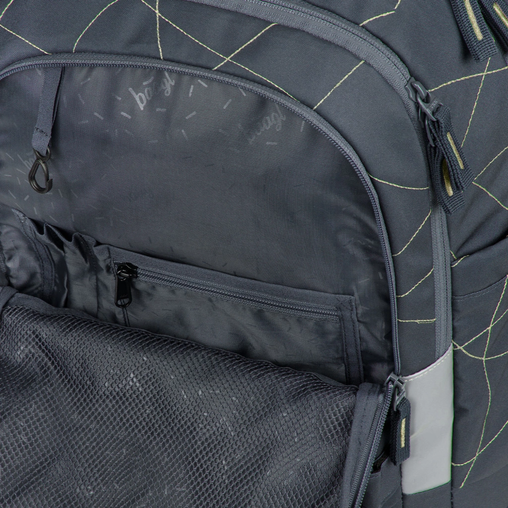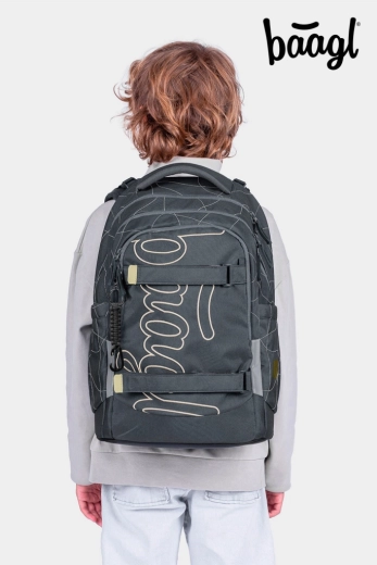 Vnútorný priestor tvorí trojkomorový organizér so zamatovým vreckom na notebook, ktoré chráni elektroniku pred poškrabaním. Pevné bočné vrecká pojmú fľaše BAAGL z tritanu, predná kompresia podrží mikinu či skateboard a štýlový prívesok dodá batohu osobitý vzhľad.