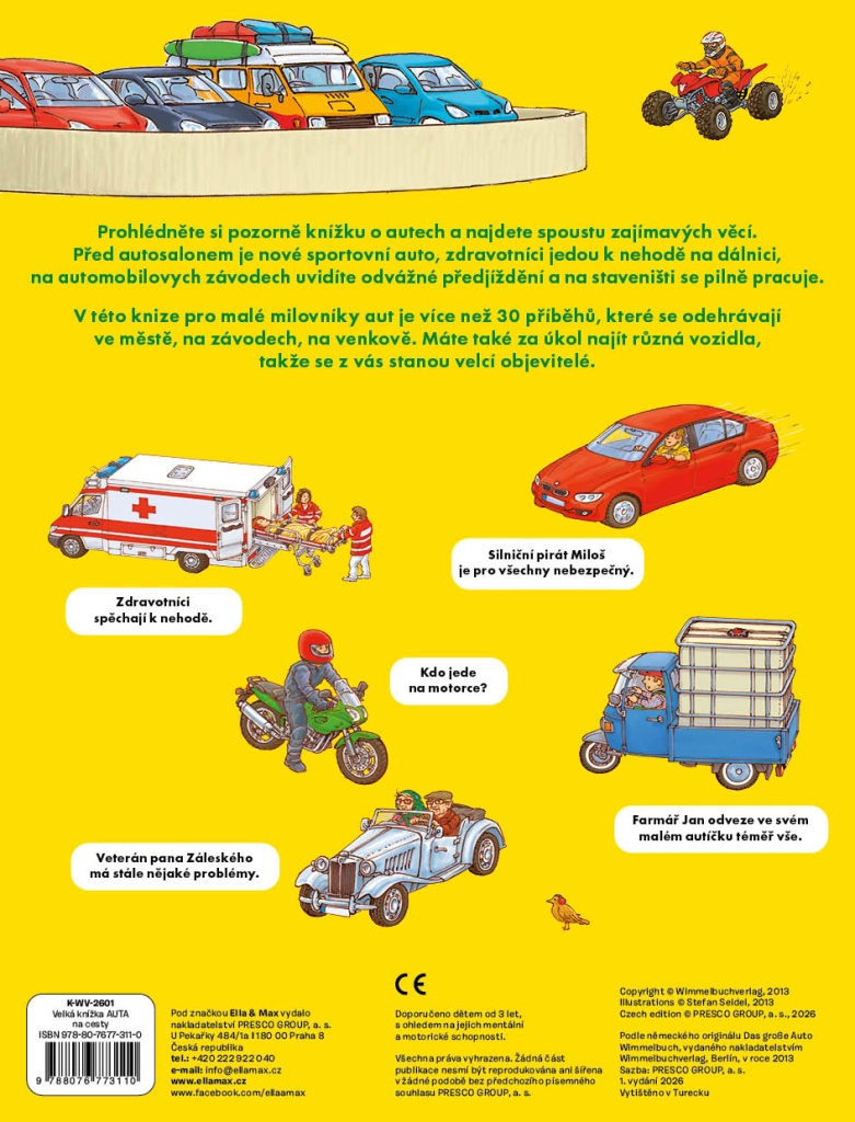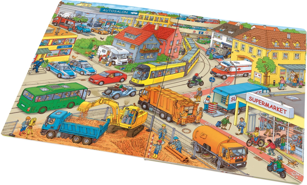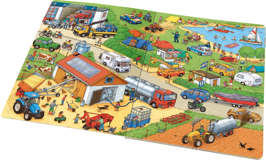 Táto bohato ilustrovaná kniha nadchne malých milovníkov motorov a strojov. Na každej stránke nájdu deti množstvo situácií z reálneho sveta – od rušných ciest cez staveniská až po pretekárske okruhy. Ilustrácie sú plné drobných detailov, ktoré udržia pozornosť a nabádajú k pozorovaniu a rozprávaniu.