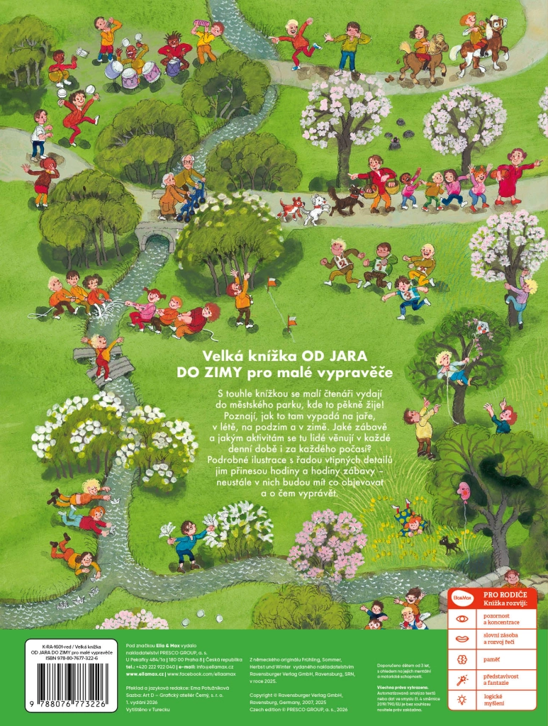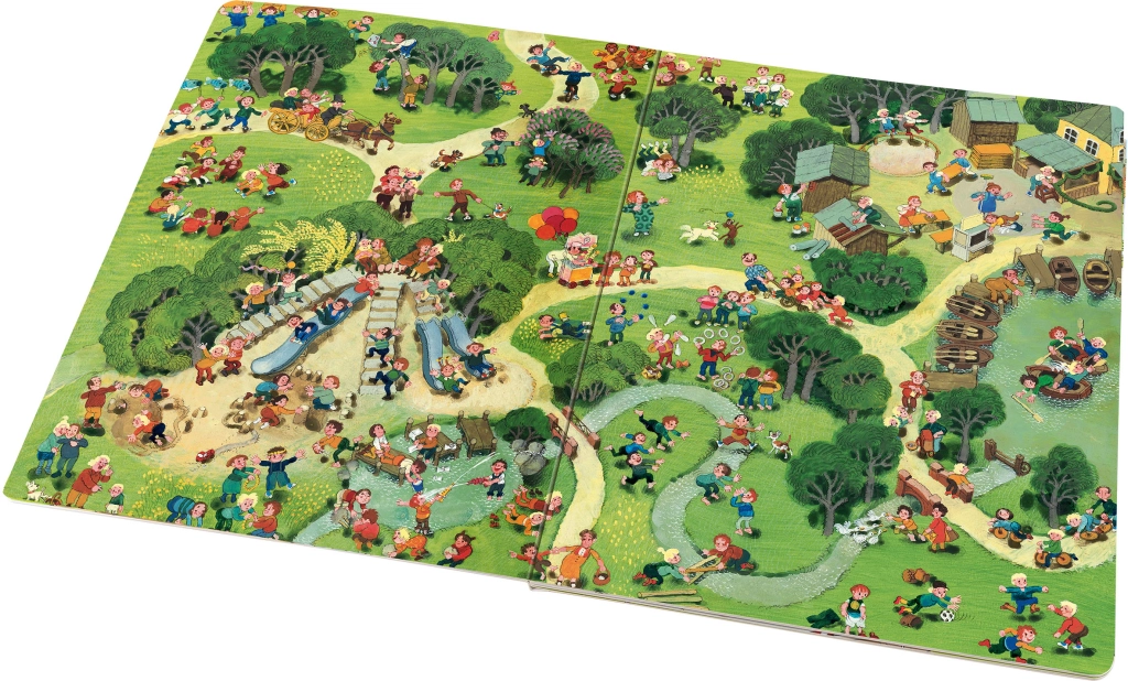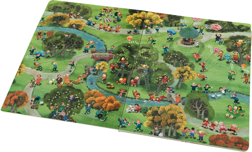 Táto veľkoformátová obrázková kniha prevedie deti rušným mestským parkom naprieč štyrmi ročnými obdobiami – jarou, letom, jeseňou a zimou. Každá strana je plná drobných príbehov, aktivít a postavičiek, ktoré sa menia podľa denného času aj počasia. Vďaka bohatým ilustráciám deti stále objavujú nové súvislosti a rozvíjajú schopnosť pozorovania.