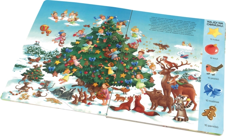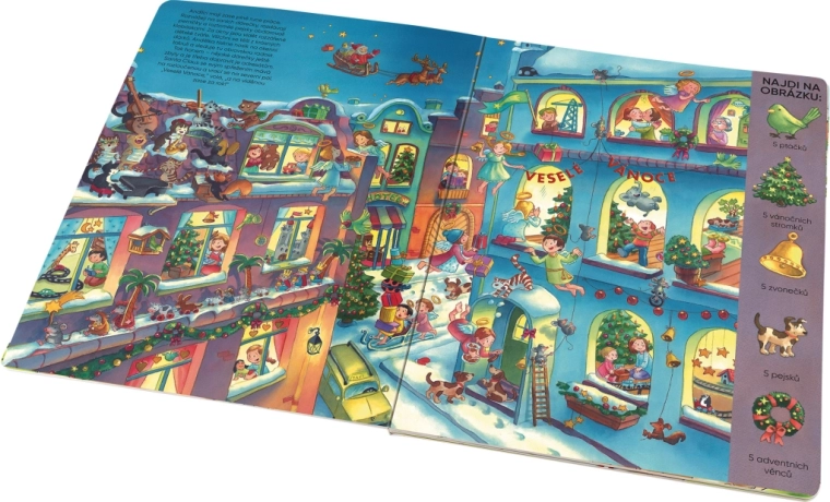 Táto veľká obrázková kniha prináša deťom atmosféru Vianoc priamo domov. Deti môžu spolu s rodičmi objavovať bohato ilustrované scény, rozprávať vlastné príbehy a pritom rozvíjať slovnú zásobu, pozornosť a vizuálne vnímanie. Každá dvojstrana ponúka výzvy na vyhľadávanie predmetov podľa zadania, čo z knihy robí skvelú aktivitu na spoločné zimné večery.