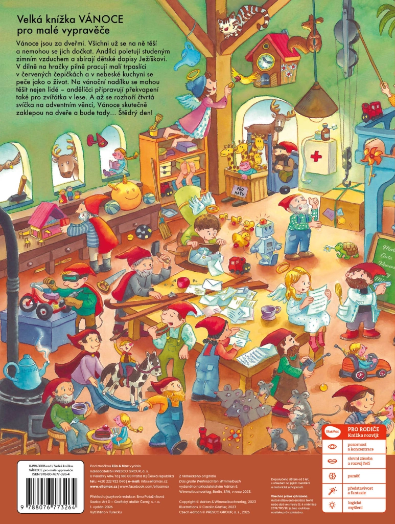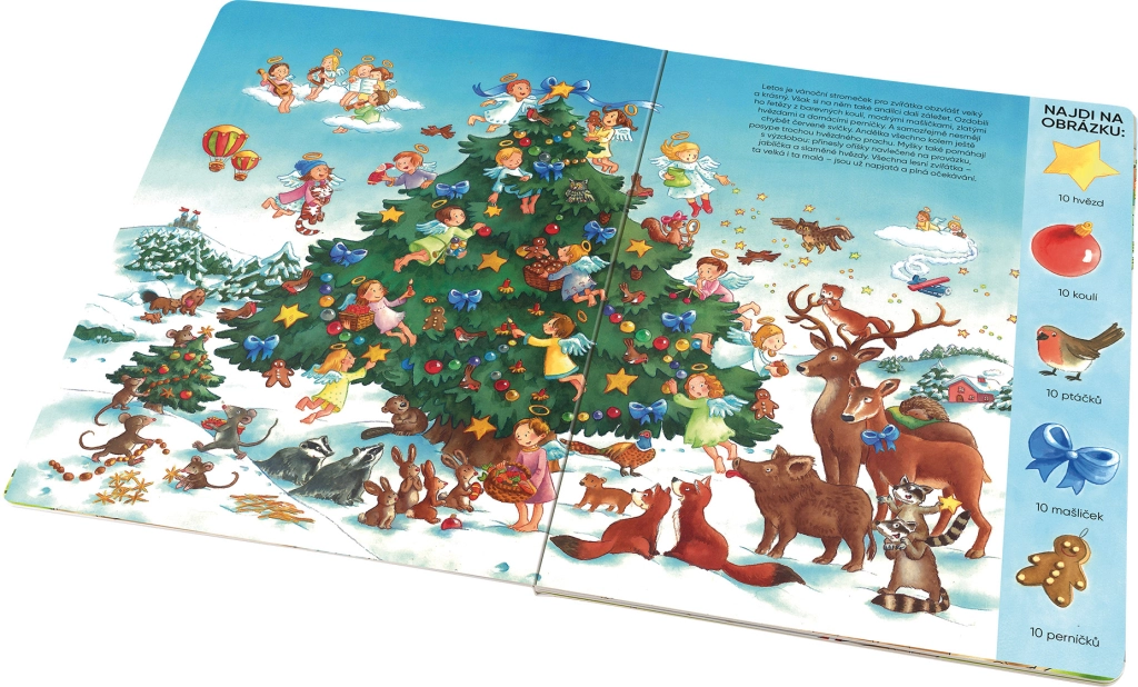 Prejdite dielňu škriatkov, sledujte anjelikov, ktorí zbierajú listy Ježiškovi, a nahliadnite do nebeskej kuchyne, kde sa usilovne pečie. Nezabúda sa ani na zvieratká v lese – aj pre ne je pripravené prekvapenie. Vďaka veľkému formátu a zrozumiteľným zadaniam je kniha ideálna pre predškolákov aj mladšie školské deti.