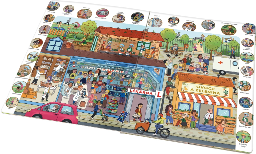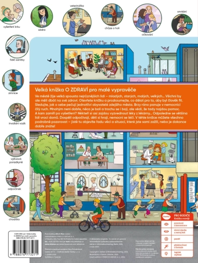 Táto veľkoformátová kniha pozýva deti preskúmať živé mesto, kde sa všetci starajú o svoje zdravie – od ranného ruchu v nemocnici až po popoludňajšie návraty domov. Deti nahliadnu do prostredia ambulancií, čakární aj lekární a pochopia, že aj keď sa niekedy bojíme, v zdravotníckych zariadeniach nájdeme pomoc.