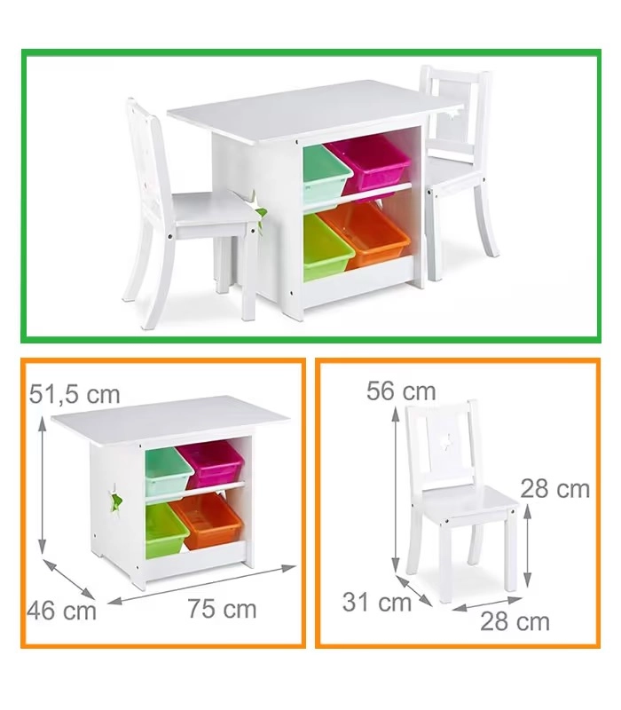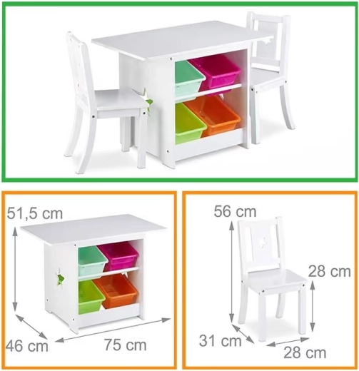 Tento 3v1 detský set spája pracovnú a hernú plochu s chytrým úložným priestorom. Bočné police stola pojmú 4 vyberateľné plastové boxy, do ktorých ľahko roztriedite kocky, pastelky, puzzle alebo knihy. Dve stoličky zaistia pohodlné sedenie pre súrodencov či kamar áta a kompaktné rozmery šetria miesto aj v menších izbách.