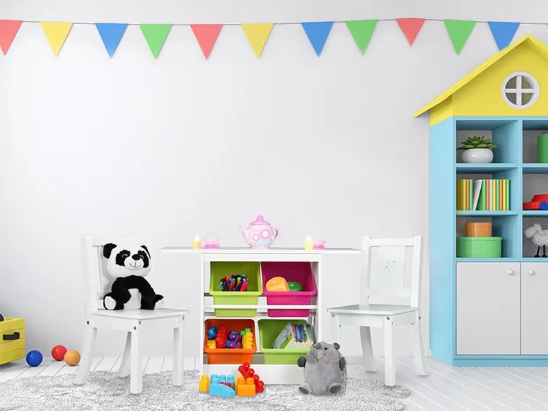 Stôl, 2 stoličky a organizér v jednom šetria priestor a ponúkajú dostatok miesta na hranie, tvorenie aj učenie dvoch detí naraz.