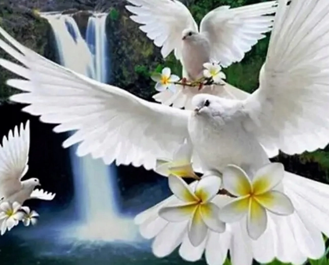 - Elegantný motív bielych holubíc vo formáte 30 × 40 cm