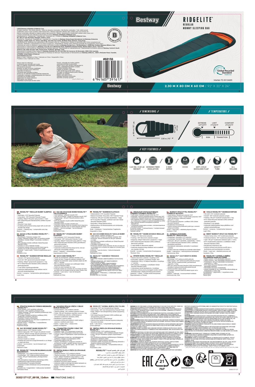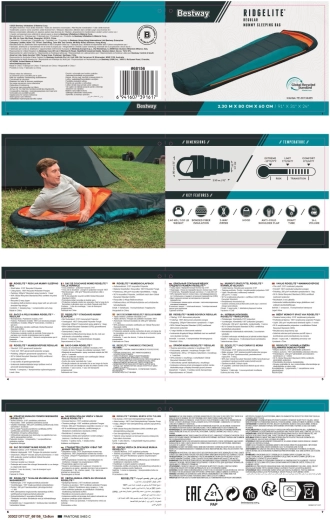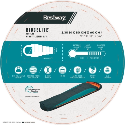 BESTWAY Ridgelite je mumiový spacák, ktorý kombinuje tepelný komfort, nízku hmotnosť a udržateľný prístup. Ergonomický tvar 230 × 80/60 cm minimalizuje tepelné straty, zatiaľ čo výplň z jednej vrstvy recyklovaného polyesteru 280 g/m² a materiály s certifikáciou GRS predstavujú zodpovednú voľbu pre prírodu aj spoľahlivý výkon v teréne.