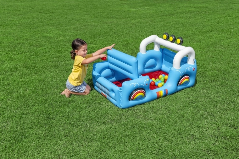 Nafukovacie hracie centrum v tvare auta s motívmi safari prináša deťom od 2 rokov pohodlné a bezpečné miesto na hru doma aj vonku. Vďaka mäkkým nafukovacím stenám a červenej podlahe je sedenie aj kotúľanie loptičiek maximálne pohodlné a bezpečné. Farebné detaily, veselé zvieratká a biele „roll bary“ s dekoratívnymi svetlami podporujú fantáziu a tematickú hru.
