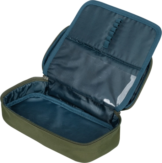 Set dopĺňa priestranný peračník s dvojitou chlopňou a vreckom, skladacia športová taška HOOP (cca 22 l, 170 g) s nastaviteľným popruhom, ľadvinka na drobnosti a viacúčelový organizér/obal. Všetko v jednotnom dizajne Olive z recyklovaných, odolných materiálov.
