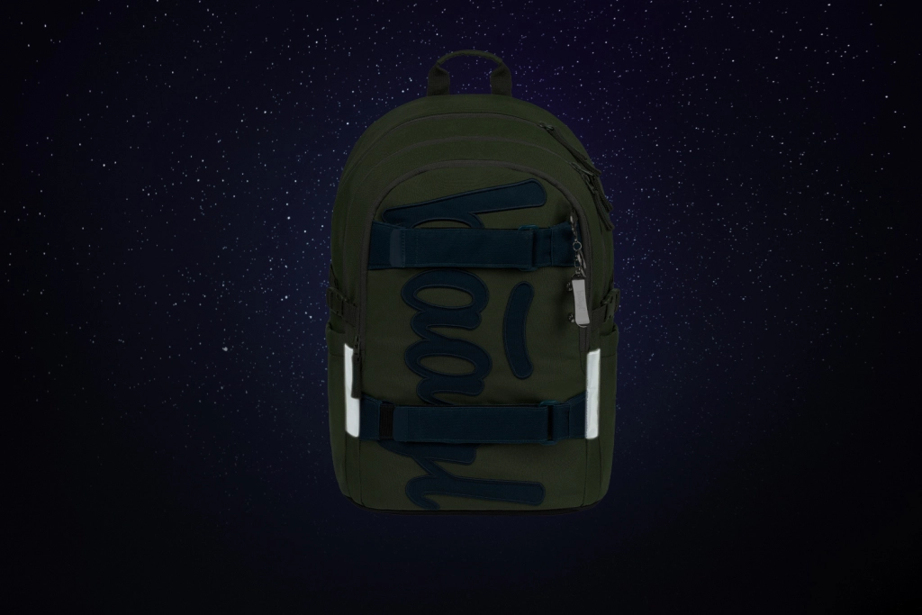 Praktická školská sada BAAGL Skate Olive kombinuje ľahké a odolné vybavenie pre žiakov od 3. triedy ZŠ až po študentov. Set zahŕňa ergonomický batoh s úchytom na skateboard, priestranný peračník, skladaciu športovú tašku, ľadvinku na nevyhnutnosti a obal/organizér na príslušenstvo či notebook. Všetko je z recyklovaných, vodeodolných materiálov s reflexnými prvkami a spoľahlivými zipsami YKK, podporené certifikáciou GRS.