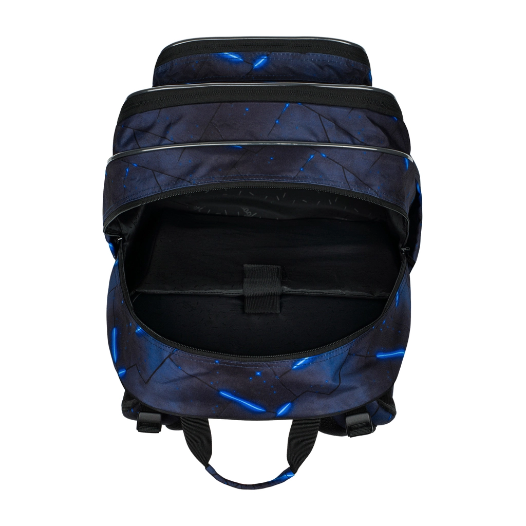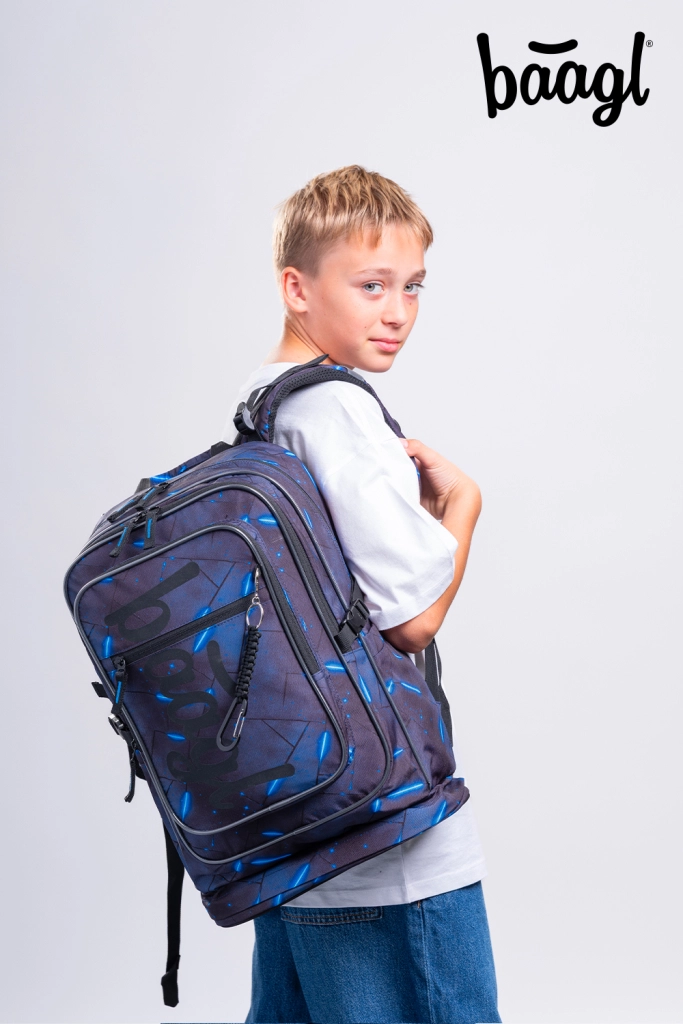 Školský set BAAGL Cubic Flash v tmavomodrom geometrickom dizajne so svetlými akcentmi elegantne zladí všetko školské aj voľnočasové vybavenie. Hlavnou hviezdou je ergonomický batoh s tromi komorami, premysleným organizérom, vystuženým tajným vreckom a bezpečnými reflexnými prvkami. Vďaka nízkej hmotnosti 1 200 g, nastaviteľným ramenným, prsným aj kompresným popruhom a priedušnému chrbtovému panelu sa pohodlne nosí po celý deň.