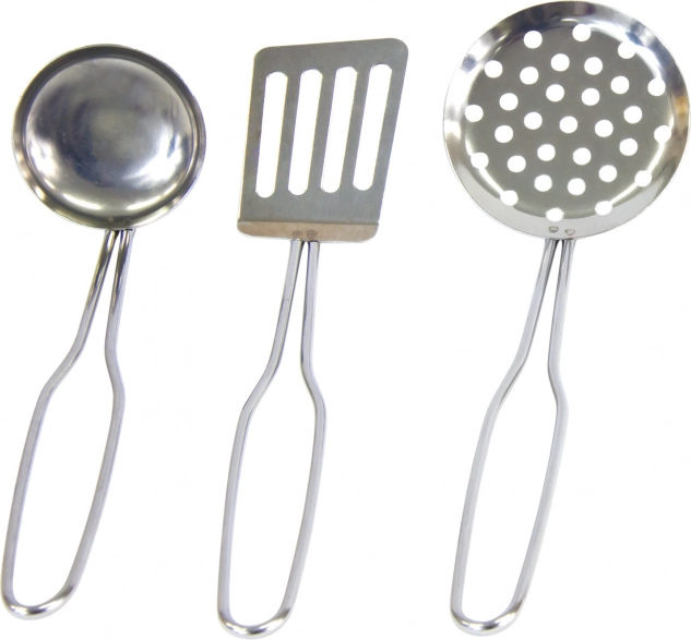 Hrnce, panvica a náradie z kovu vyzerajú ako skutočné, takže deti môžu napodobňovať varenie aj servírovanie s maximálnou vierohodnosťou.