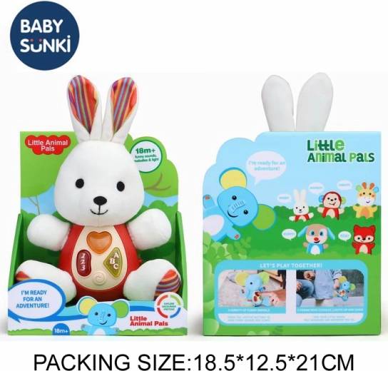 Po vložení 2× AAA batérií (nie sú súčasťou balenia) sa roztomilý zajačik rozsvieti a sprevádza deti príjemnými zvukmi alebo melódiami. Bezpečné prevedenie a atraktívny dizajn podporujú rozvoj zmyslov a podnecujú fantáziu.