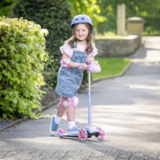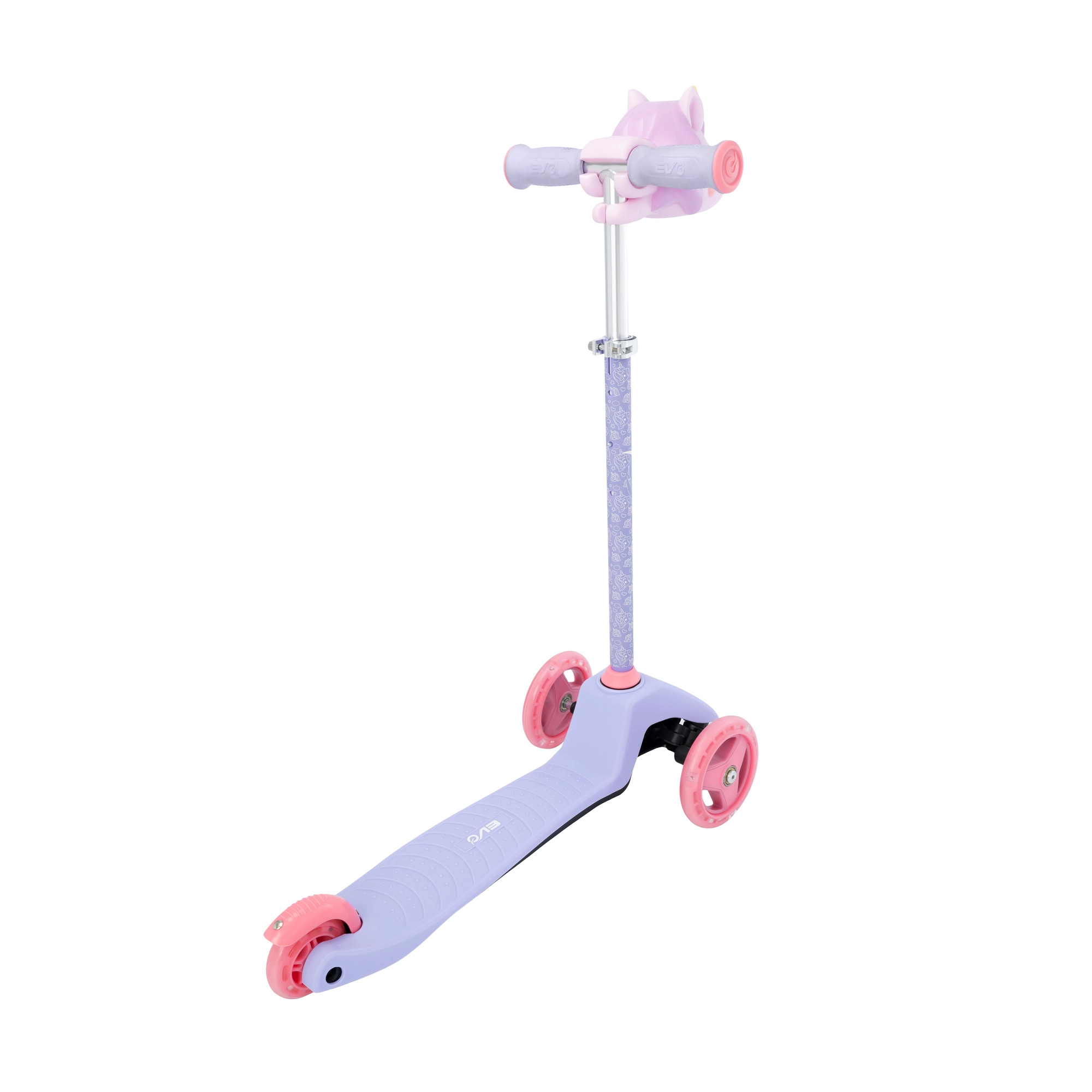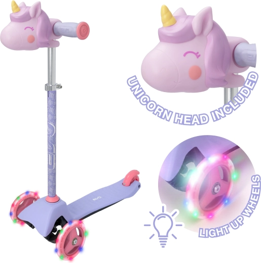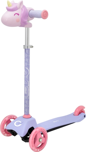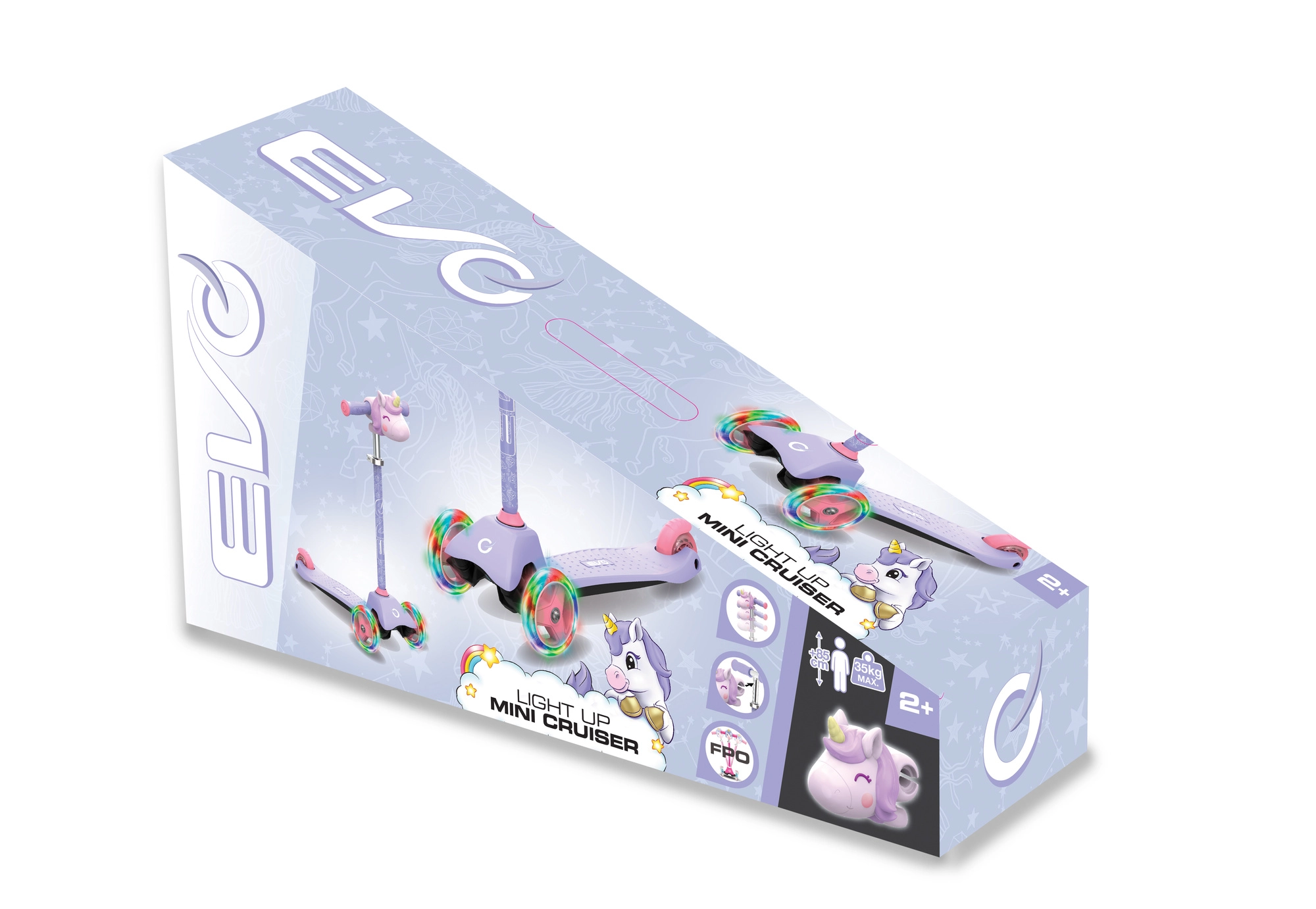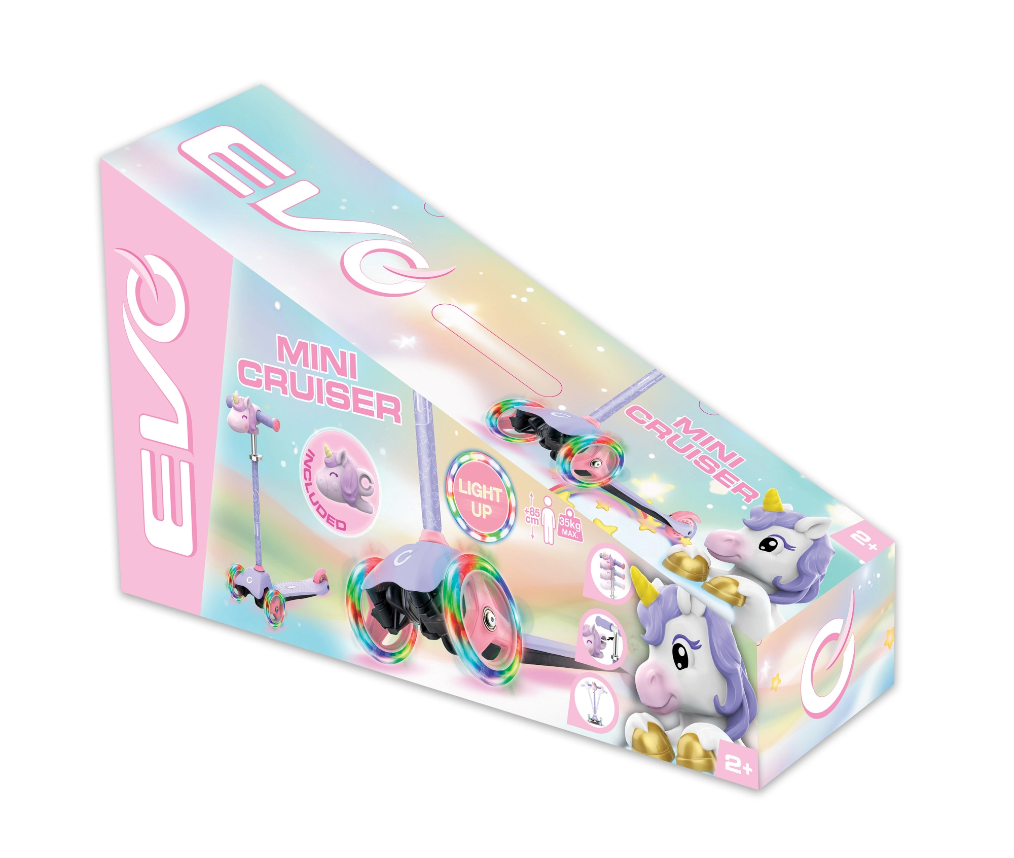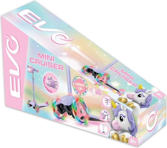 Detská trojkolesová kolobežka EVO Light Up Mini Cruiser s motívom jednorožca poteší malých jazdcov už od 2 rokov. Ponúka stabilné tri kolesá, široký nízky nášľap, nastaviteľné riadidlá a svietiace predné kolieska pre ešte zábavnejšiu jazdu. Vďaka balančnému riadeniu nakláňaním rozvíja rovnováhu a koordináciu, zatiaľ čo zadná nožná brzda zabezpečuje bezpečné zastavenie.