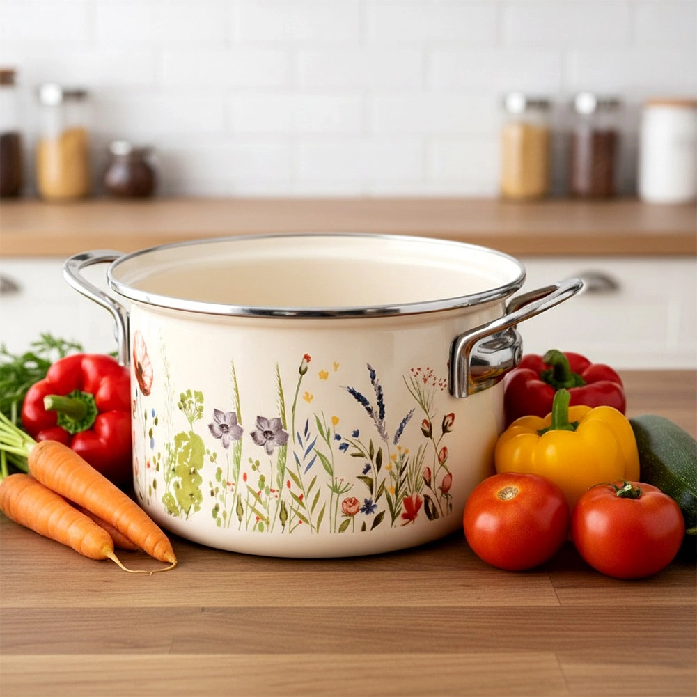 Krémový smaltovaný hrniec ORION Maki s priemerom 20 cm a objemom 3 l kombinuje nadčasový dizajn s praktickosťou na každodenné varenie. Kvalitný smalt na oceli je hygienický, odolný a šetrný k potravinám, nerezový rantl aj kovové úchyty zabezpečujú trvácnosť a bezpečnú manipuláciu.