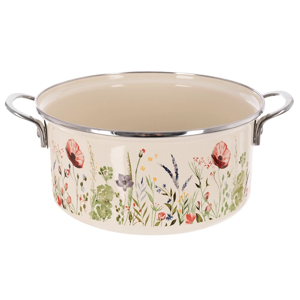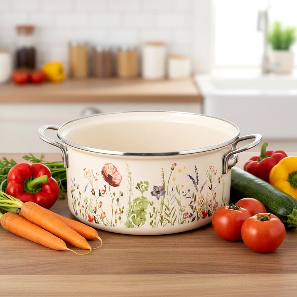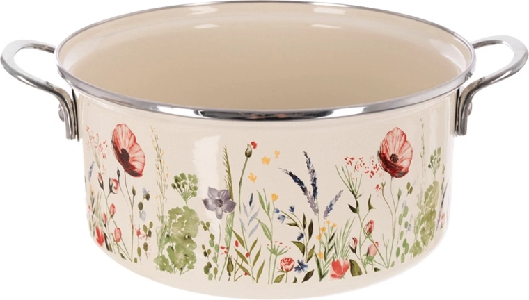 Obľúbený hrniec v retro štýle kombinuje odolnosť smaltu a každodennú praktickosť. Objem 5 l, priemer 26 cm a výška 12 cm poskytujú dostatok priestoru na polievky, omáčky aj rodinné porcie. Krémové prevedenie s kvetinovým dekorom ozdobí kuchyňu aj stôl, takže v ňom môžete pokrmy rovno servírovať.