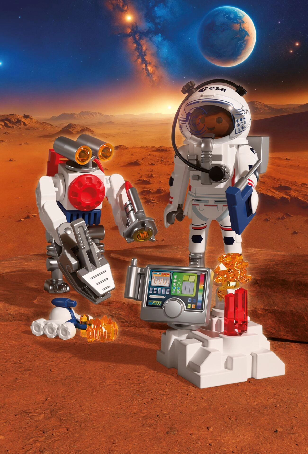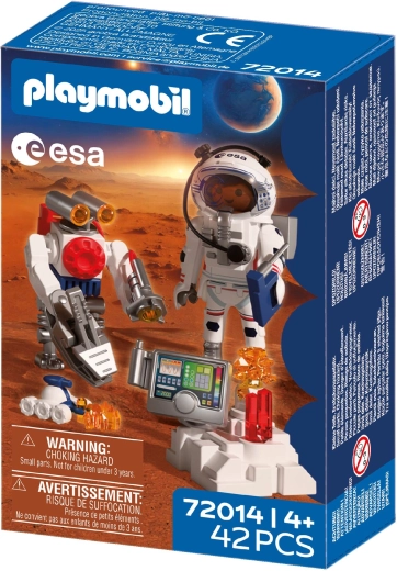 Zažite autentické vesmírne dobrodružstvo s PLAYMOBIL v spolupráci s ESA. Astronaut s pomocou obratného robota a zručného vozíka skúma povrch červenej planéty, zbiera vzorky pôdy a odhaľuje tajomné signály z útrob Marsu. Pohyblivé, uchopovacie rameno robota uľahčuje dvíhanie nálezov, zatiaľ čo vozík pripomínajúci škorpión sa dostane aj do ťažko prístupných miest.