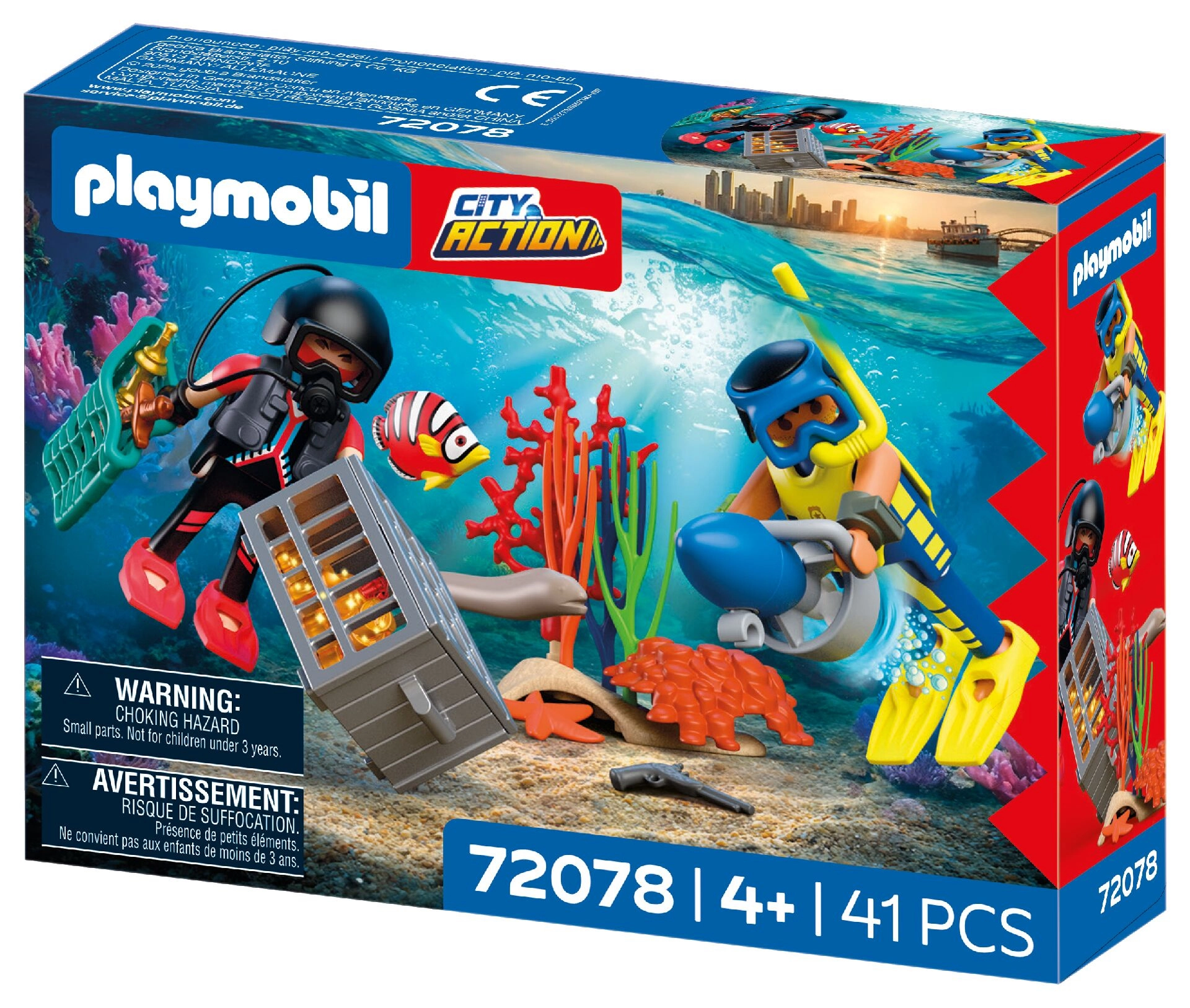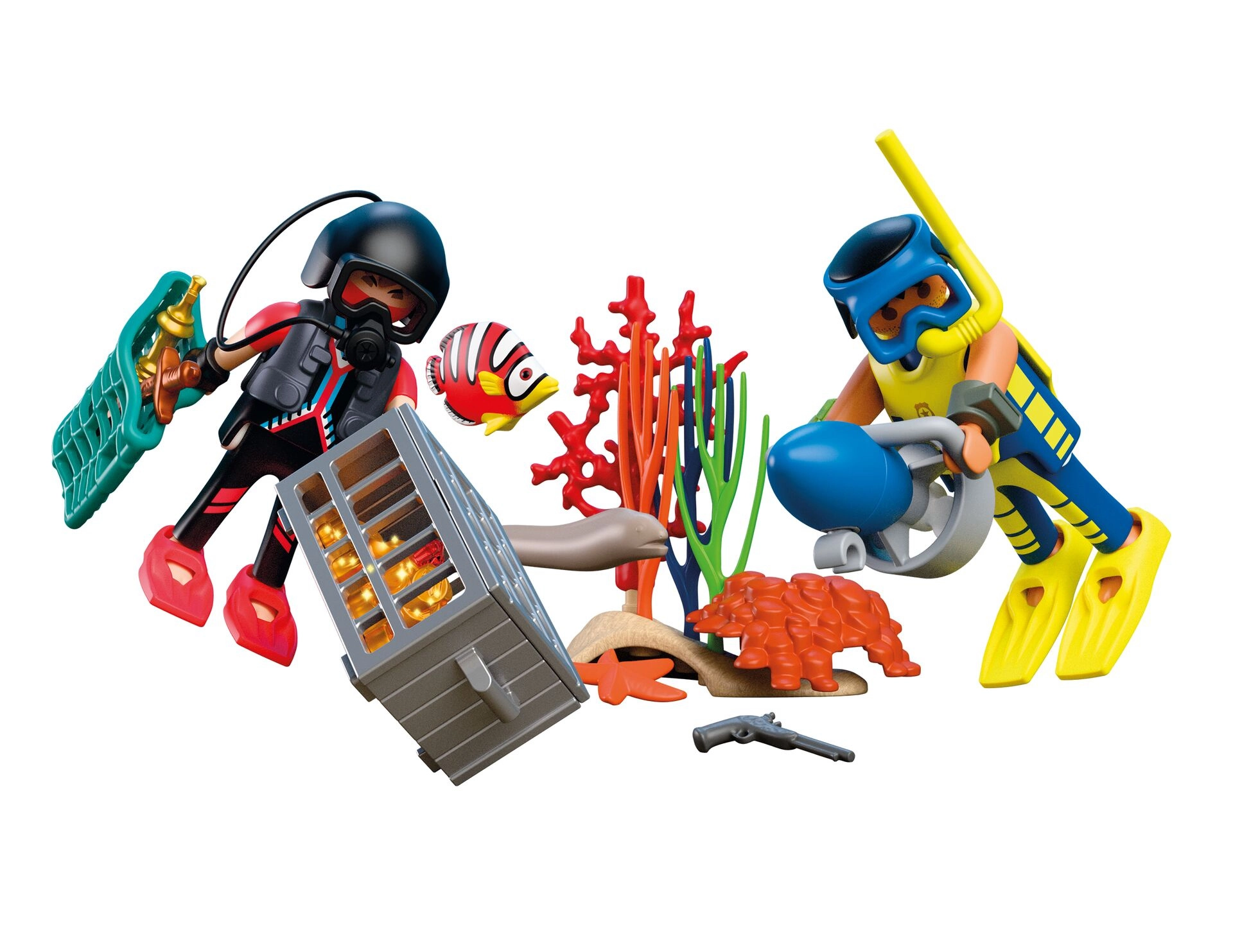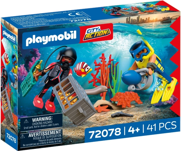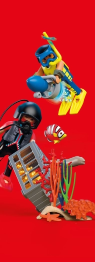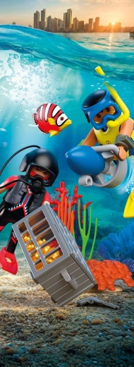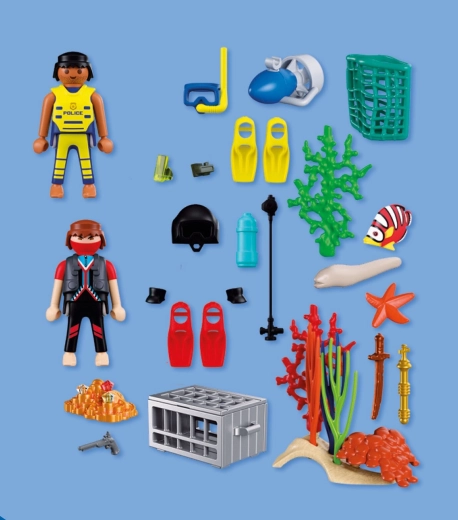 Táto sada ponúka akčnú naháňačku v hlbinách mora: pozorný policajný potápač sleduje zlodeja, ktorý sa snaží ukryť skrinku s pokladom medzi riasami a koralmi. Vďaka podvodnému skútru, výstroji a realistickým doplnkom čaká deti množstvo napínavých misií aj voľného objavovania podmorského sveta.