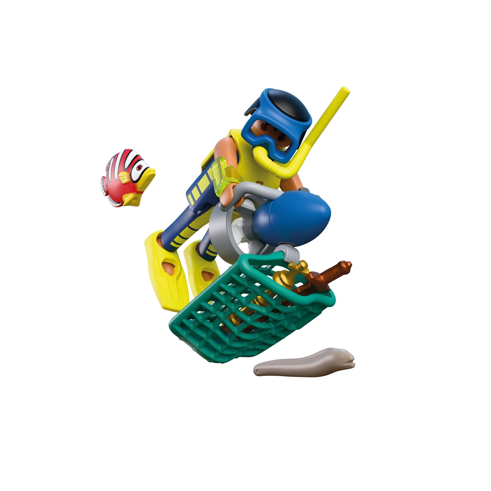 Masky, plutvy, fľaša s kyslíkom a podvodný skútor podporujú kreatívne hranie; kôš umožní zbierať nálezy a vytvárať nové misie.