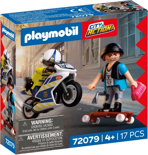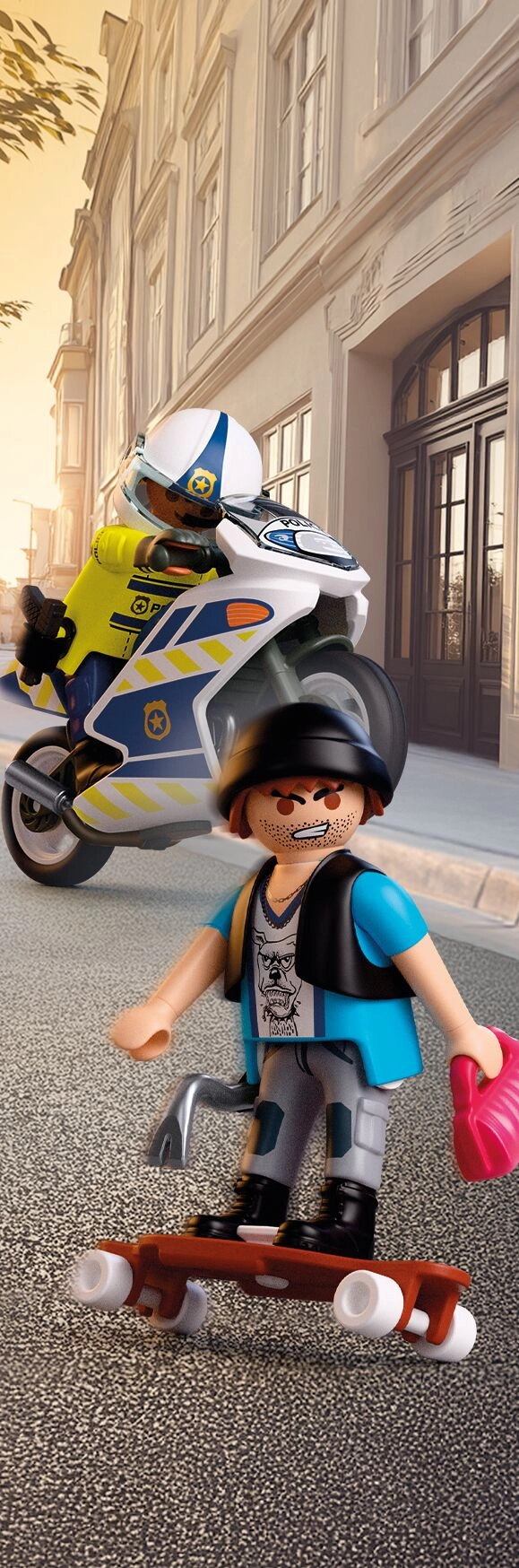 Rozbehnite napínavú akciu v meste s hernou sadou PLAYMOBIL City Action. Policajt na motocykli prenasleduje zlodeja na skateboarde a snaží sa získať späť ukradnutú kabelku. Sada obsahuje 2 figúrky, policajnú motorku, longboard/skateboard a množstvo autentických doplnkov pre realistickú hru rolí.