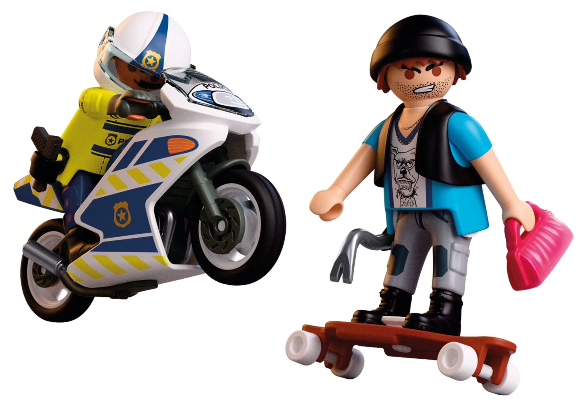 - Obsah sady: 2 figúrky (policajt a zlodej, cca 7,5 cm), policajný motocykel, skateboard/longboard, prilba, rukavice, puzdro, pištoľ, čiapka, kabelka, držiak a páčidlo.