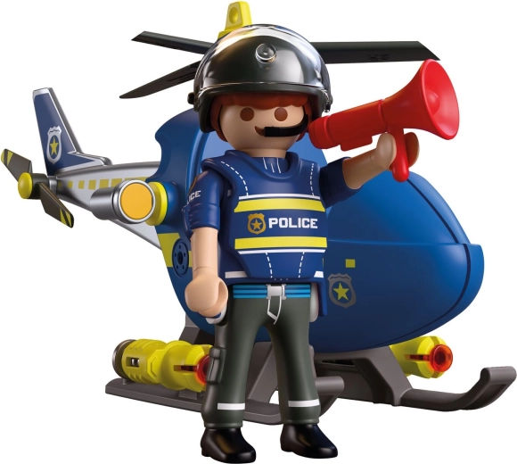 - Figúrka policajta (cca 7,5 cm), vrtuľník, helma, 2 diely, 3 projektily, megafón