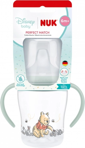 Učiaca fľaša NUK Perfect Match s motívom DISNEY Medvedík Pú s objemom 150 ml pomáha deťom prirodzene prejsť z fľaše na hrnček. Má mimoriadne mäkký a pružný náustok so širokou oporou pier, ergonomické protišmykové držadlá pre jednoduché uchopenie, technológiu Anti‑Leak proti vytekaniu a teplotný indikátor pre bezpečné podávanie nápoja. Vyrobené v Nemecku z kvalitných materiálov.