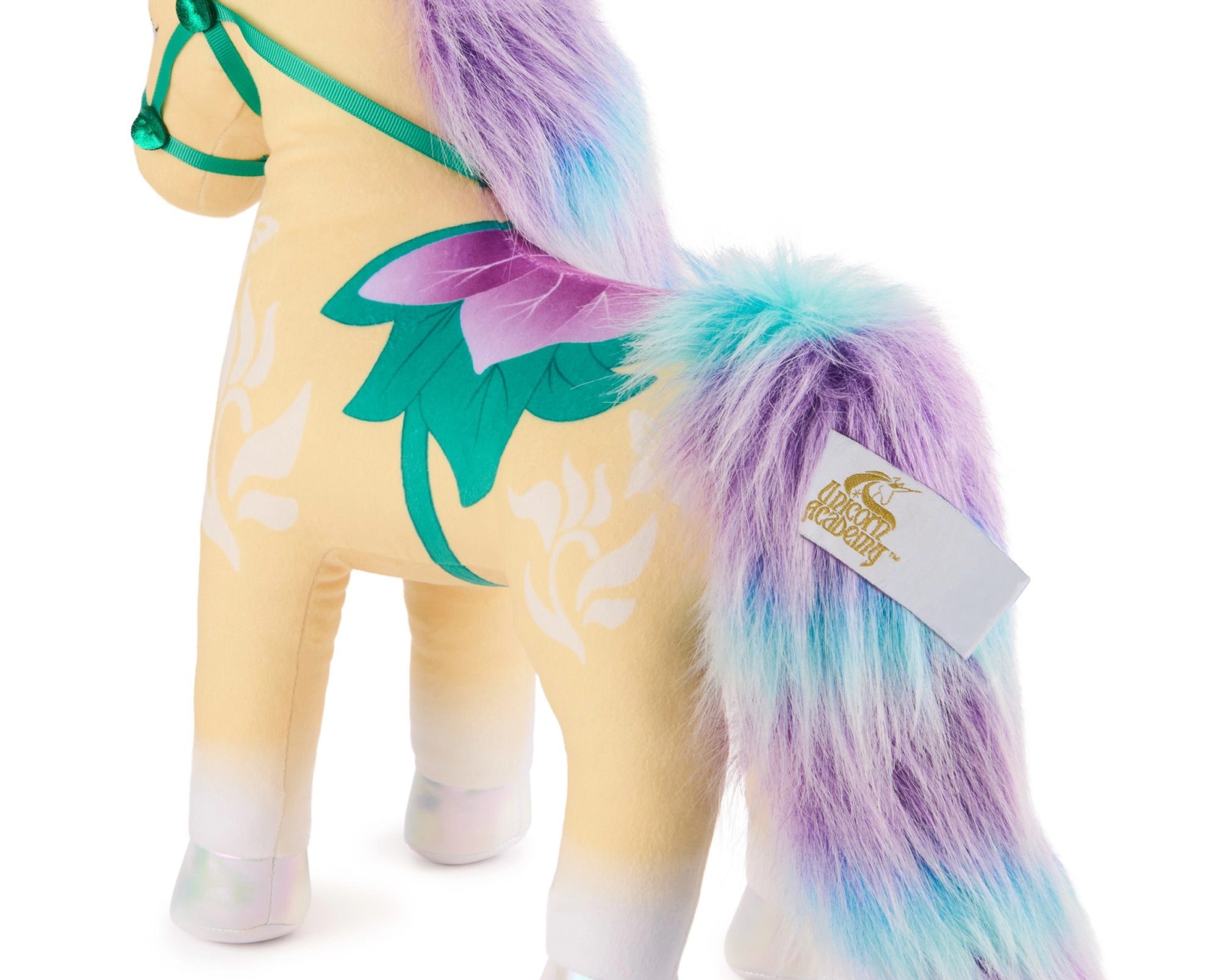 Preneste sa do sveta fantázie so štýlovým plyšákom inšpirovaným obľúbeným seriálom Netflix a knihami Unicorn Academy. Jednorožec Leaf verne odráža seriálovú postavu – od zlatého rohu cez opálové kopytá až po jemné kvetinové detaily a zeleno‑fialové postroje. Vďaka kvalitnému, hebkému materiálu je skvelý na objímanie aj každodennú hru.