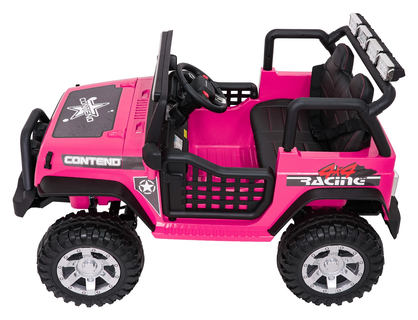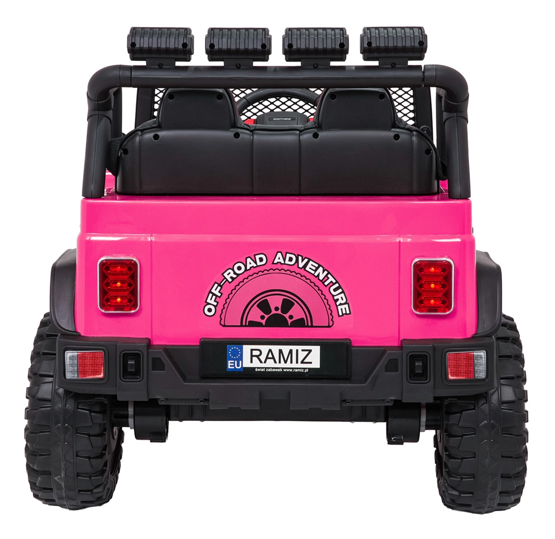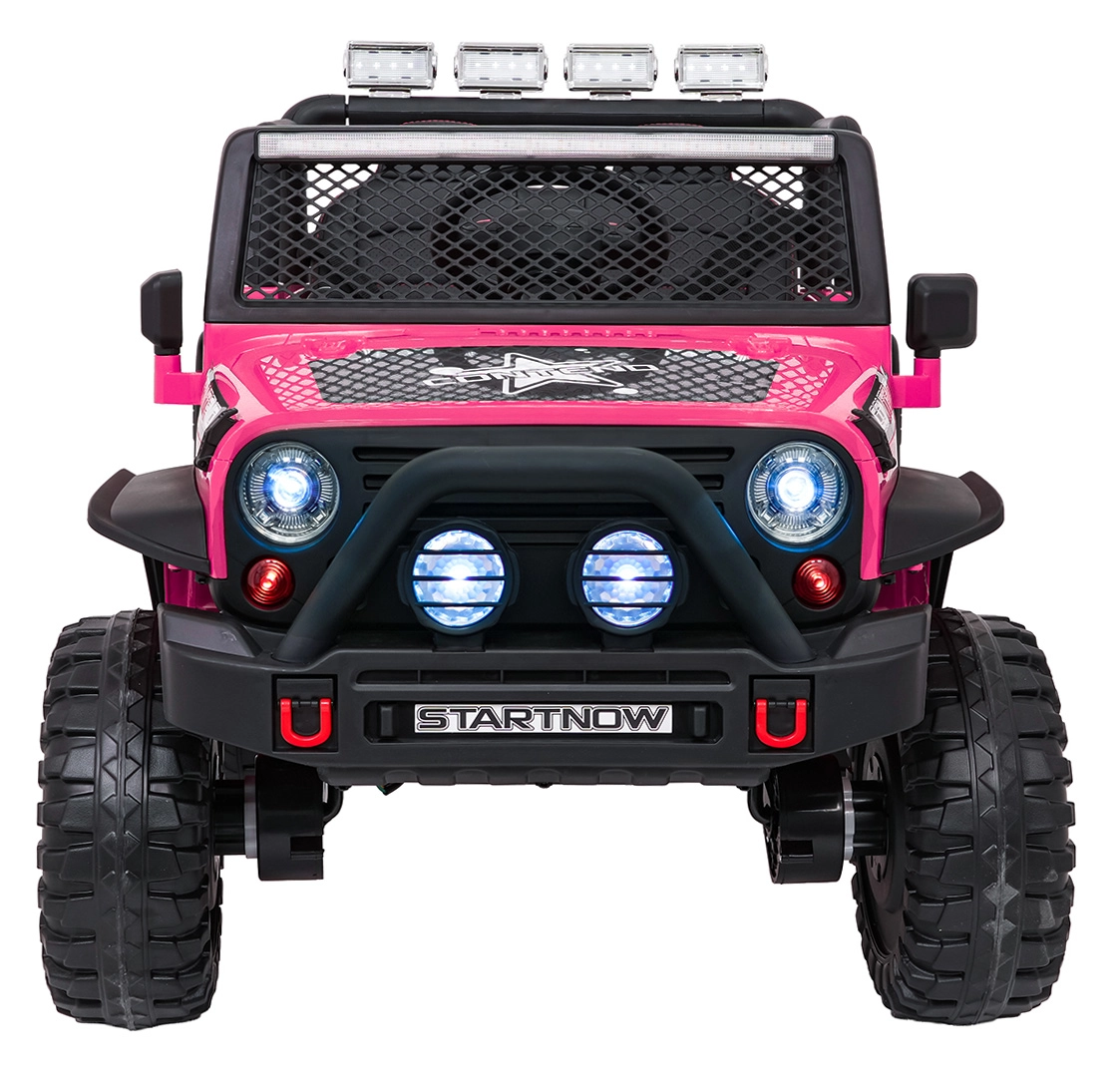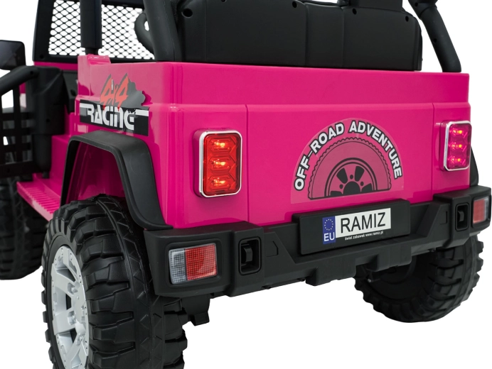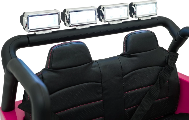 Štýlové elektrické autíčko v štýle jeepu pre dve deti ponúkne silný pohon 4x4 (4×45 W), dvojitú batériu 2× 12 V 7 Ah, mäkké EVA kolesá, predné aj zadné LED svetlá vrátane strešnej rampy a pohodlné sedadlo z eko kože s pásmi. Súčasťou je rodičovský diaľkový ovládač 2,4 GHz so zastavením STOP a multimediálny panel s FM rádiom, MP3, Bluetooth, USB a AUX.
